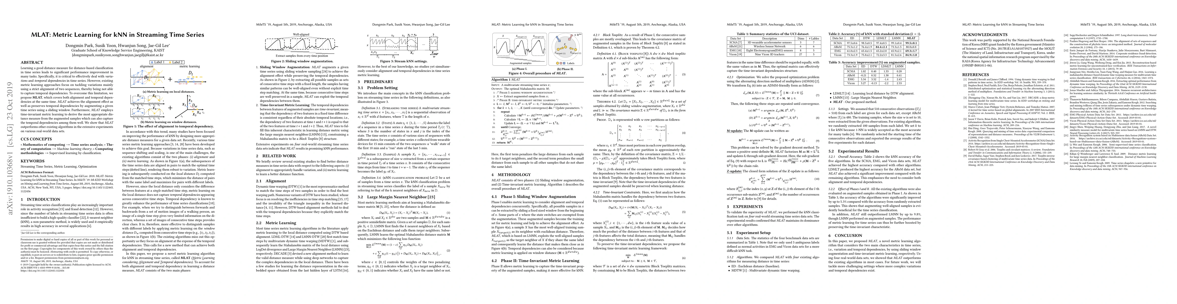 Learning a good distance measure for distance-based classification in time series leads to significant performance improvement in many tasks. Specifically, it is critical to effectively deal with variations and temporal dependencies in time series. However, existing metric learning approaches focus on tackling variations mainly using a strict alignment of two sequences, thereby being not able to capture temporal dependencies. To overcome this limitation, we propose MLAT, which covers both alignment and temporal dependencies at the same time. MLAT achieves the alignment effect as well as preserves temporal dependencies by augmenting a given time series using a sliding window. Furthermore, MLAT employs time-invariant metric learning to derive the most appropriate distance measure from the augmented samples which can also capture the temporal dependencies among them well. We show that MLAT outperforms other existing algorithms in the extensive experiments on various real-world data sets.