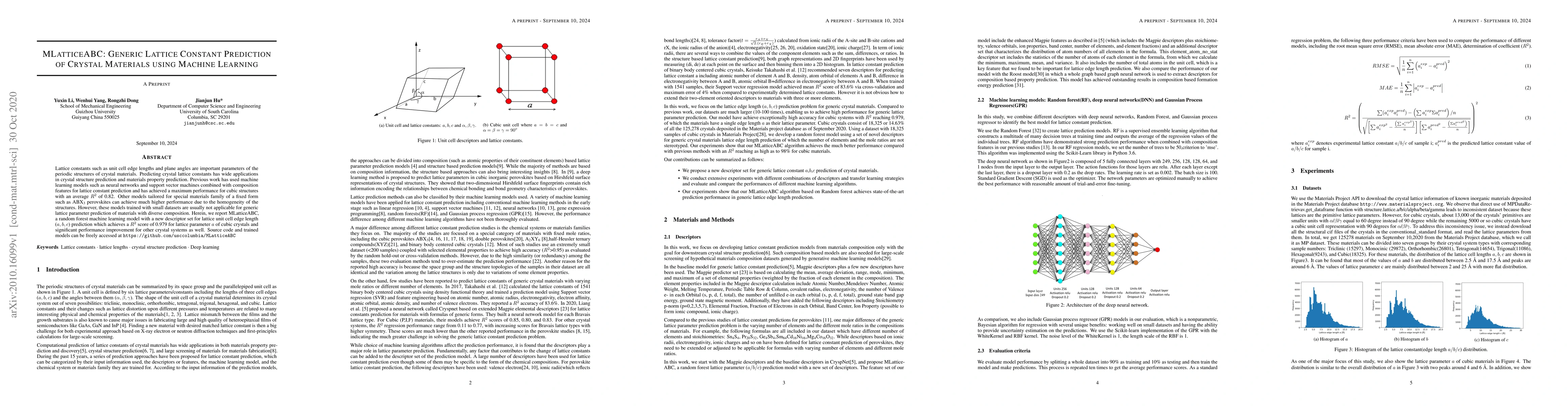 Summary: MLatticeABC leverages a random forest machine learning model with a novel descriptor set to predict lattice constants in crystal materials, achieving an R² score of 0.979 for cubic crystals and significantly improving predictions for other crystal systems. The model is designed for generic lattice parameter prediction across diverse material compositions.