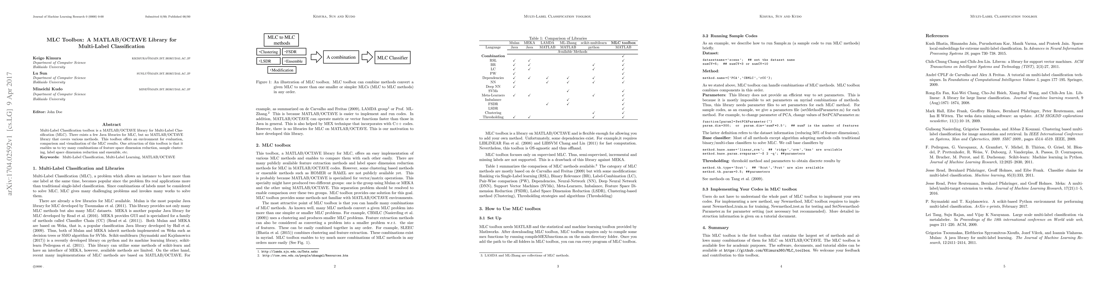 Multi-Label Classification toolbox is a MATLAB/OCTAVE library for Multi-Label Classification (MLC). There exists a few Java libraries for MLC, but no MATLAB/OCTAVE library that covers various methods. This toolbox offers an environment for evaluation, comparison and visualization of the MLC results. One attraction of this toolbox is that it enables us to try many combinations of feature space dimension reduction, sample clustering, label space dimension reduction and ensemble, etc.