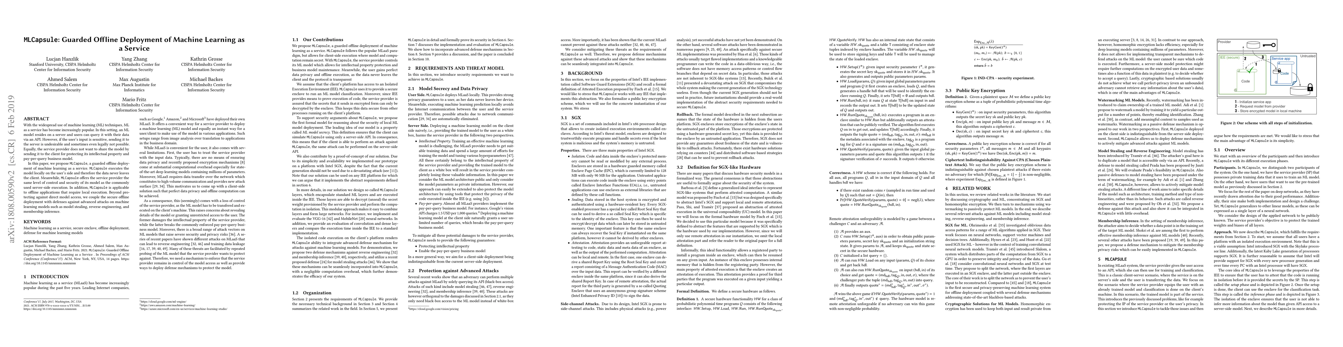 MLCapsule proposes a guarded offline deployment of machine learning as a service, enabling local execution on the user's side to protect sensitive data while maintaining the service provider's control and security, and defending against advanced attacks like model stealing and reverse engineering.