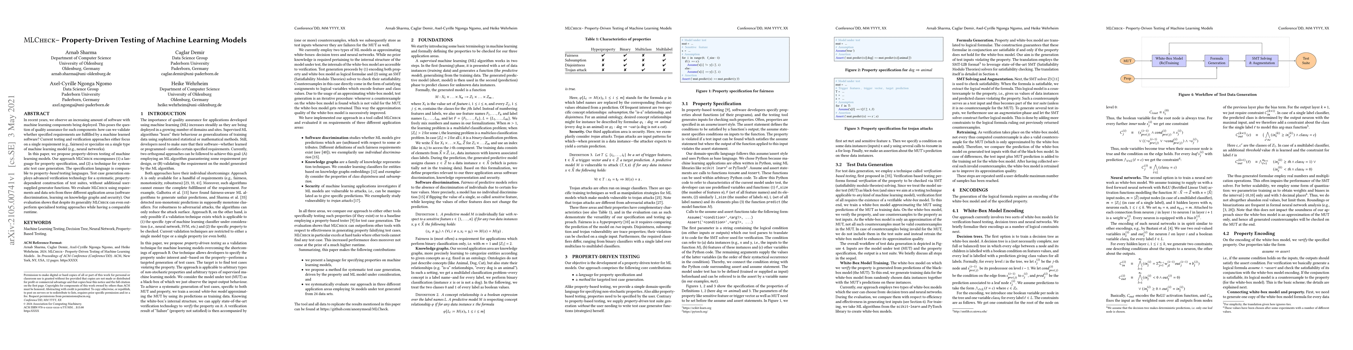 This paper proposes MLCheck, a property-driven testing framework for validating machine learning models against specified requirements. It features a specification language and a systematic test case generation technique, outperforming specialized testing methods in evaluations across diverse application areas.