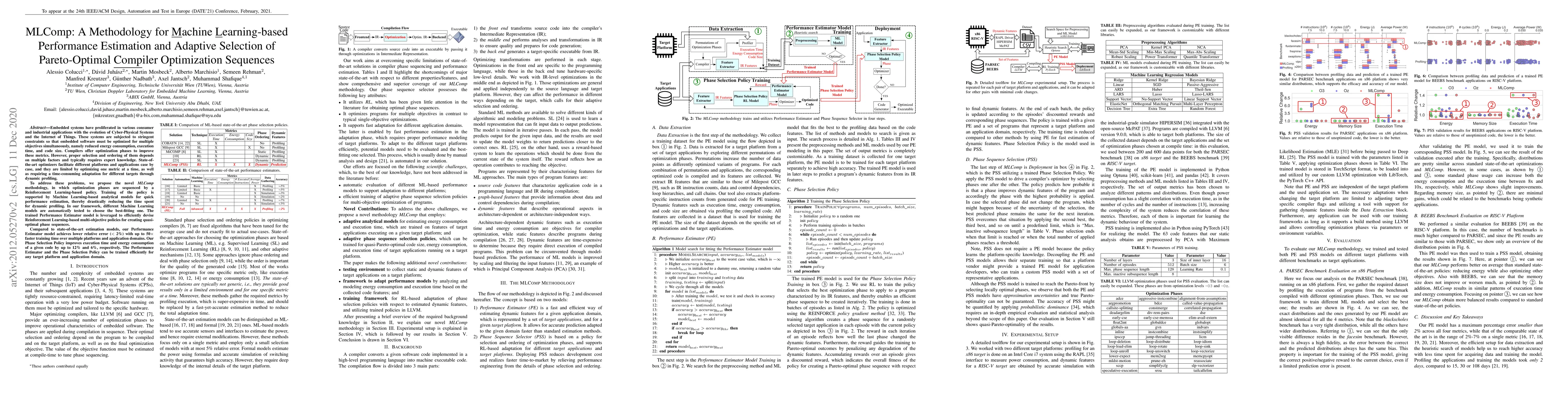Embedded systems have proliferated in various consumer and industrial applications with the evolution of Cyber-Physical Systems and the Internet of Things. These systems are subjected to stringent constraints so that embedded software must be optimized for multiple objectives simultaneously, namely reduced energy consumption, execution time, and code size. Compilers offer optimization phases to improve these metrics. However, proper selection and ordering of them depends on multiple factors and typically requires expert knowledge. State-of-the-art optimizers facilitate different platforms and applications case by case, and they are limited by optimizing one metric at a time, as well as requiring a time-consuming adaptation for different targets through dynamic profiling. To address these problems, we propose the novel MLComp methodology, in which optimization phases are sequenced by a Reinforcement Learning-based policy. Training of the policy is supported by Machine Learning-based analytical models for quick performance estimation, thereby drastically reducing the time spent for dynamic profiling. In our framework, different Machine Learning models are automatically tested to choose the best-fitting one. The trained Performance Estimator model is leveraged to efficiently devise Reinforcement Learning-based multi-objective policies for creating quasi-optimal phase sequences. Compared to state-of-the-art estimation models, our Performance Estimator model achieves lower relative error (<2%) with up to 50x faster training time over multiple platforms and application domains. Our Phase Selection Policy improves execution time and energy consumption of a given code by up to 12% and 6%, respectively. The Performance Estimator and the Phase Selection Policy can be trained efficiently for any target platform and application domain.