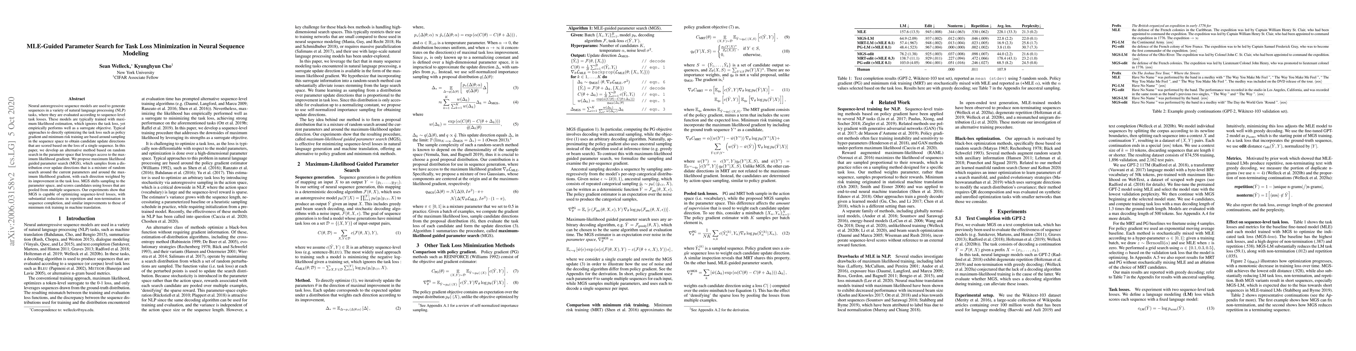 Neural autoregressive sequence models are used to generate sequences in a variety of natural language processing (NLP) tasks, where they are evaluated according to sequence-level task losses. These models are typically trained with maximum likelihood estimation, which ignores the task loss, yet empirically performs well as a surrogate objective. Typical approaches to directly optimizing the task loss such as policy gradient and minimum risk training are based around sampling in the sequence space to obtain candidate update directions that are scored based on the loss of a single sequence. In this paper, we develop an alternative method based on random search in the parameter space that leverages access to the maximum likelihood gradient. We propose maximum likelihood guided parameter search (MGS), which samples from a distribution over update directions that is a mixture of random search around the current parameters and around the maximum likelihood gradient, with each direction weighted by its improvement in the task loss. MGS shifts sampling to the parameter space, and scores candidates using losses that are pooled from multiple sequences. Our experiments show that MGS is capable of optimizing sequence-level losses, with substantial reductions in repetition and non-termination in sequence completion, and similar improvements to those of minimum risk training in machine translation.