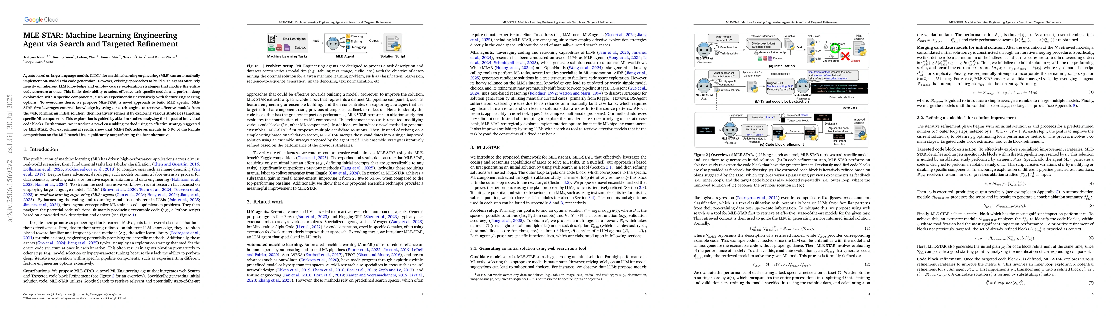 Agents based on large language models (LLMs) for machine learning engineering (MLE) can automatically implement ML models via code generation. However, existing approaches to build such agents often rely heavily on inherent LLM knowledge and employ coarse exploration strategies that modify the entire code structure at once. This limits their ability to select effective task-specific models and perform deep exploration within specific components, such as experimenting extensively with feature engineering options. To overcome these, we propose MLE-STAR, a novel approach to build MLE agents. MLE-STAR first leverages external knowledge by using a search engine to retrieve effective models from the web, forming an initial solution, then iteratively refines it by exploring various strategies targeting specific ML components. This exploration is guided by ablation studies analyzing the impact of individual code blocks. Furthermore, we introduce a novel ensembling method using an effective strategy suggested by MLE-STAR. Our experimental results show that MLE-STAR achieves medals in 64% of the Kaggle competitions on the MLE-bench Lite, significantly outperforming the best alternative.