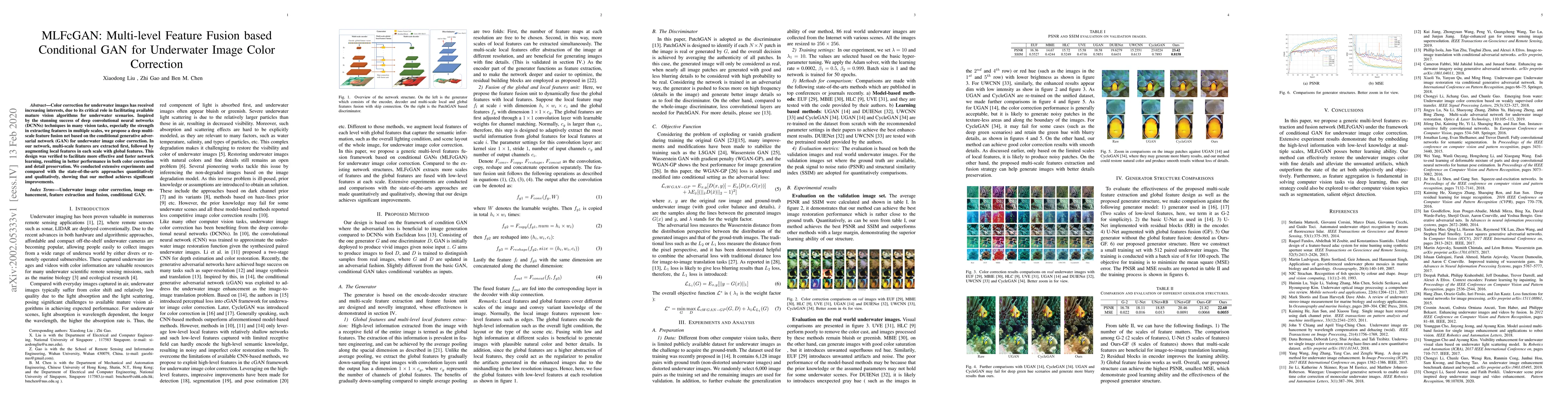 The paper proposes MLFcGAN, a multi-level feature fusion based conditional GAN for underwater image color correction, leveraging deep convolutional neural networks to extract features at multiple scales. The method combines local and global features to enhance network learning, resulting in superior color correction and detail preservation compared to state-of-the-art approaches.