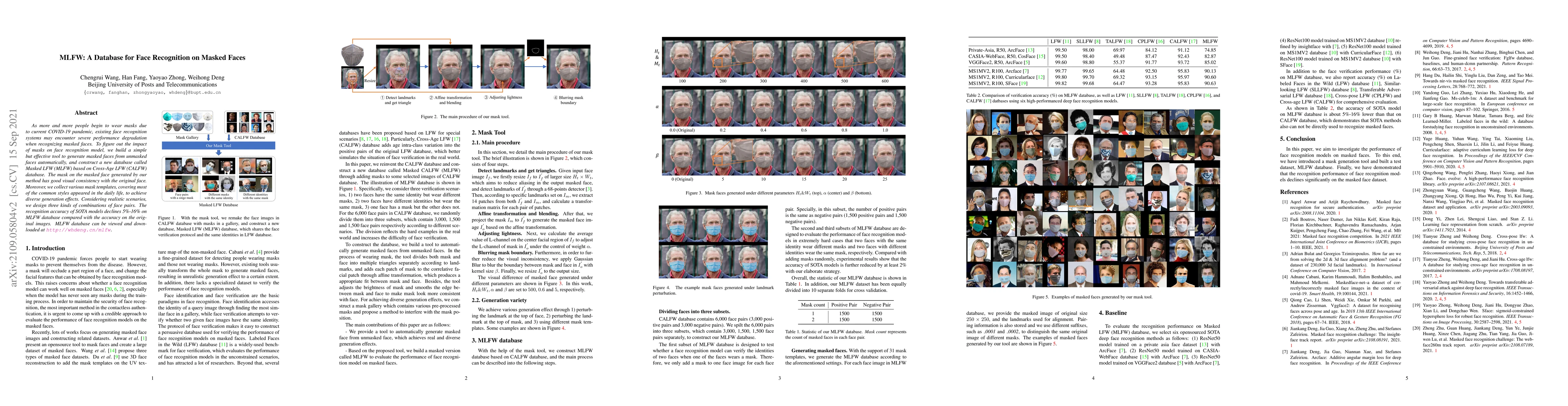 The Masked LFW (MLFW) database was created to study the impact of masks on face recognition systems, showing a 5%-16% decline in accuracy for state-of-the-art models. The database includes masked faces generated from unmasked images, featuring realistic mask styles and diverse face pairs.