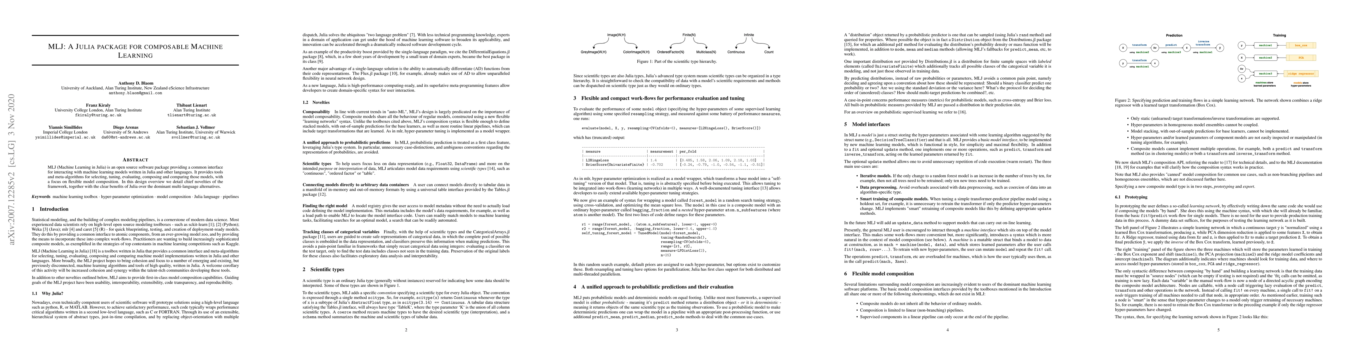 MLJ is an open-source Julia package offering a unified interface for machine learning models across various languages, emphasizing flexible model composition and providing tools for selection, tuning, evaluation, and comparison. It leverages Julia's strengths to outperform multi-language alternatives.