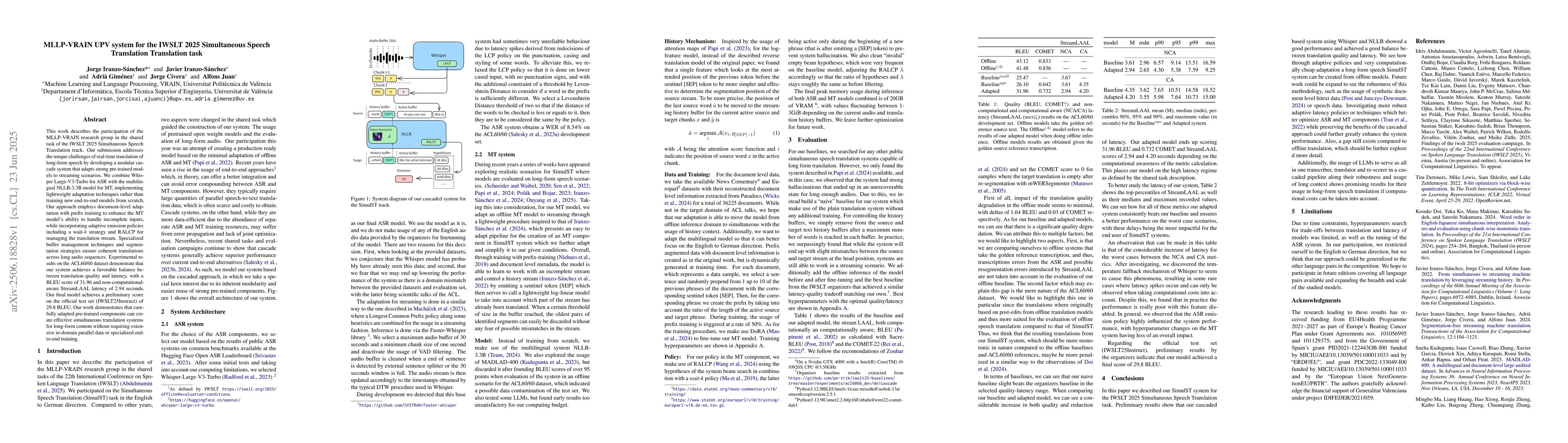 This work describes the participation of the MLLP-VRAIN research group in the shared task of the IWSLT 2025 Simultaneous Speech Translation track. Our submission addresses the unique challenges of real-time translation of long-form speech by developing a modular cascade system that adapts strong pre-trained models to streaming scenarios. We combine Whisper Large-V3-Turbo for ASR with the multilingual NLLB-3.3B model for MT, implementing lightweight adaptation techniques rather than training new end-to-end models from scratch. Our approach employs document-level adaptation with prefix training to enhance the MT model's ability to handle incomplete inputs, while incorporating adaptive emission policies including a wait-$k$ strategy and RALCP for managing the translation stream. Specialized buffer management techniques and segmentation strategies ensure coherent translations across long audio sequences. Experimental results on the ACL60/60 dataset demonstrate that our system achieves a favorable balance between translation quality and latency, with a BLEU score of 31.96 and non-computational-aware StreamLAAL latency of 2.94 seconds. Our final model achieves a preliminary score on the official test set (IWSLT25Instruct) of 29.8 BLEU. Our work demonstrates that carefully adapted pre-trained components can create effective simultaneous translation systems for long-form content without requiring extensive in-domain parallel data or specialized end-to-end training.