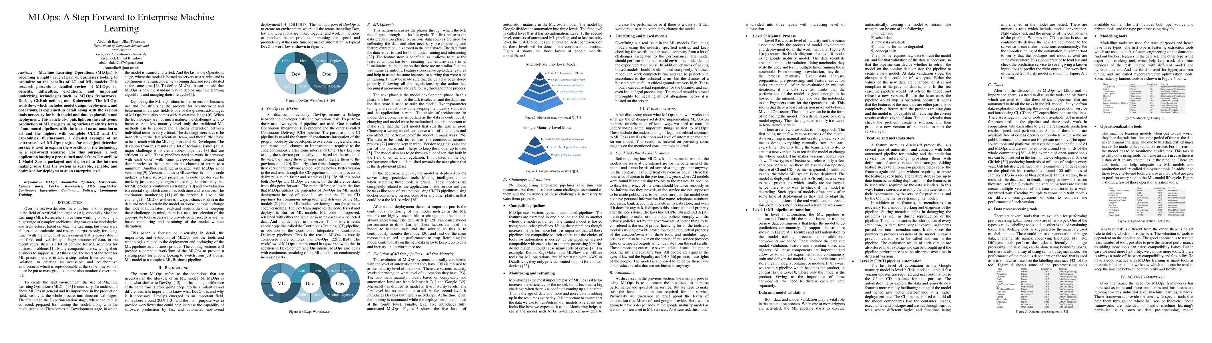 Machine Learning Operations (MLOps) is becoming a highly crucial part of businesses looking to capitalize on the benefits of AI and ML models. This research presents a detailed review of MLOps, its benefits, difficulties, evolutions, and important underlying technologies such as MLOps frameworks, Docker, GitHub actions, and Kubernetes. The MLOps workflow, which includes model design, deployment, and operations, is explained in detail along with the various tools necessary for both model and data exploration and deployment. This article also puts light on the end-to-end production of ML projects using various maturity levels of automated pipelines, with the least at no automation at all and the highest with complete CI/CD and CT capabilities. Furthermore, a detailed example of an enterprise-level MLOps project for an object detection service is used to explain the workflow of the technology in a real-world scenario. For this purpose, a web application hosting a pre-trained model from TensorFlow 2 Model Zoo is packaged and deployed to the internet making sure that the system is scalable, reliable, and optimized for deployment at an enterprise level.