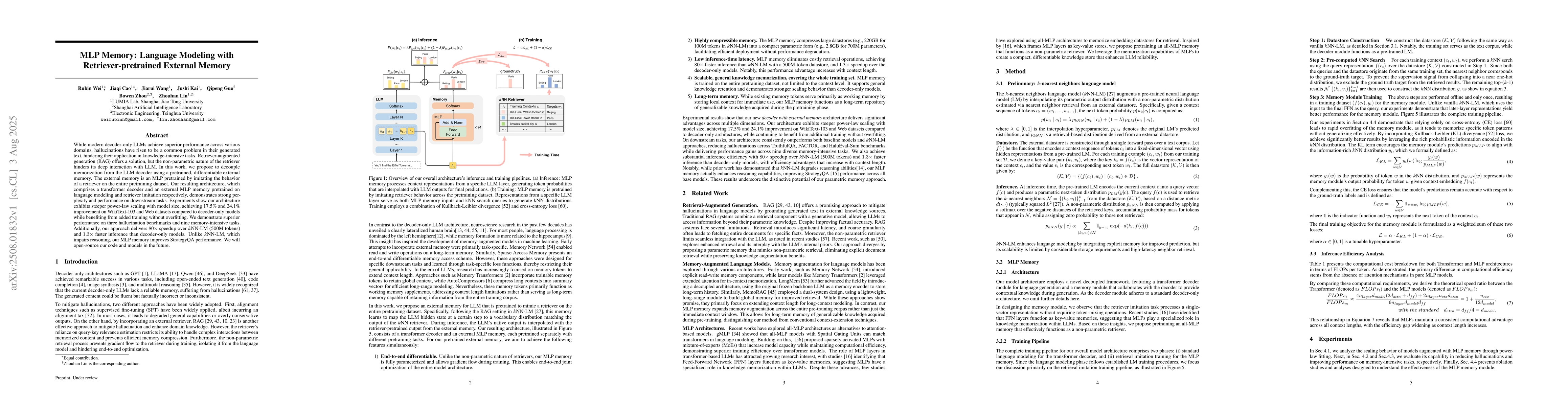 While modern decoder-only LLMs achieve superior performance across various domains, hallucinations have risen to be a common problem in their generated text, hindering their application in knowledge-intensive tasks. Retriever-augmented generation (RAG) offers a solution, but the non-parametric nature of the retriever hinders its deep interaction with LLM. In this work, we propose to decouple memorization from the LLM decoder using a pretrained, differentiable external memory. The external memory is an MLP pretrained by imitating the behavior of a retriever on the entire pretraining dataset. Our resulting architecture, which comprises a transformer decoder and an external MLP memory pretrained on language modeling and retriever imitation respectively, demonstrates strong perplexity and performance on downstream tasks. Experiments show our architecture exhibits steeper power-law scaling with model size, achieving 17.5% and 24.1% improvement on WikiText-103 and Web datasets compared to decoder-only models while benefiting from added training without overfitting. We demonstrate superior performance on three hallucination benchmarks and nine memory-intensive tasks. Additionally, our approach delivers $80\times$ speedup over $k$NN-LM (500M tokens) and $1.3\times$ faster inference than decoder-only models. Unlike $k$NN-LM, which impairs reasoning, our MLP memory improves StrategyQA performance. We will open-source our code and models in the future.