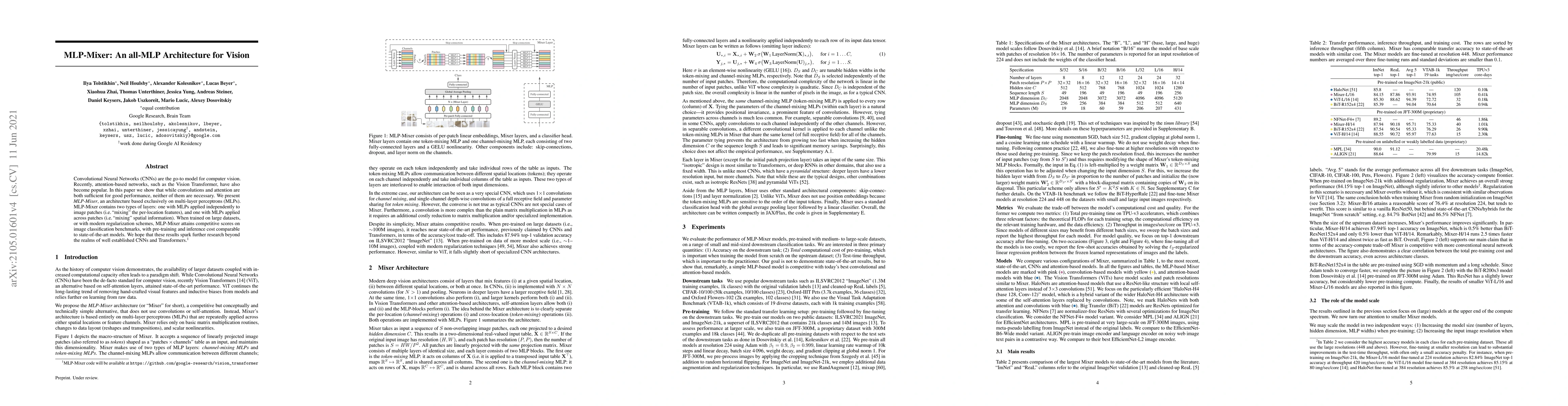 Convolutional Neural Networks (CNNs) are the go-to model for computer vision. Recently, attention-based networks, such as the Vision Transformer, have also become popular. In this paper we show that while convolutions and attention are both sufficient for good performance, neither of them are necessary. We present MLP-Mixer, an architecture based exclusively on multi-layer perceptrons (MLPs). MLP-Mixer contains two types of layers: one with MLPs applied independently to image patches (i.e. "mixing" the per-location features), and one with MLPs applied across patches (i.e. "mixing" spatial information). When trained on large datasets, or with modern regularization schemes, MLP-Mixer attains competitive scores on image classification benchmarks, with pre-training and inference cost comparable to state-of-the-art models. We hope that these results spark further research beyond the realms of well established CNNs and Transformers.
