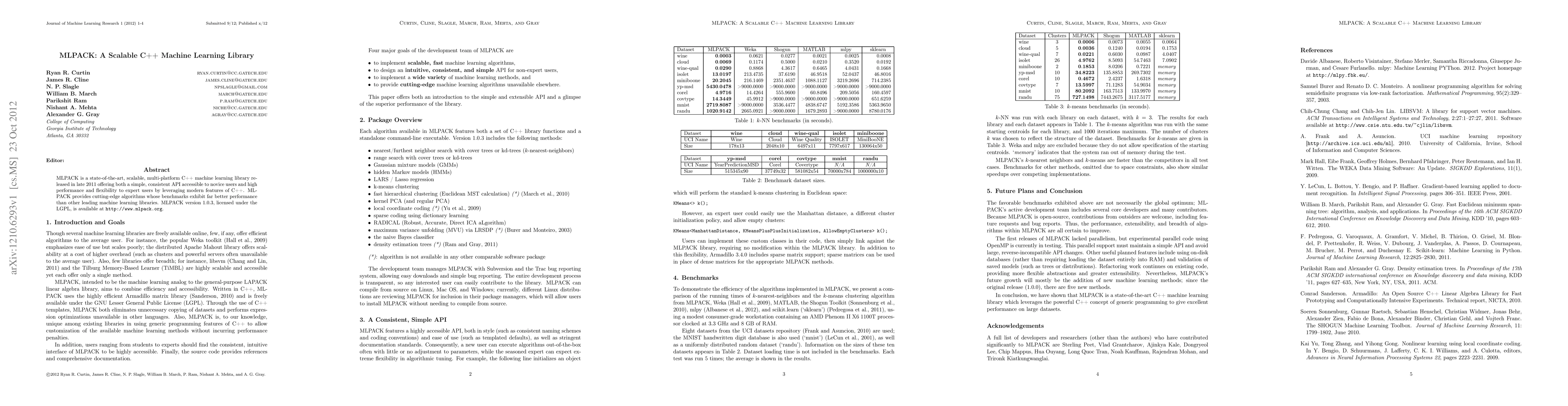 MLPACK is a scalable, multi-platform C++ machine learning library that offers a user-friendly API for novices and high performance for experts, featuring state-of-the-art algorithms that outperform other leading libraries. The latest version, 1.0.3, is available under the LGPL at http://www.mlpack.org.