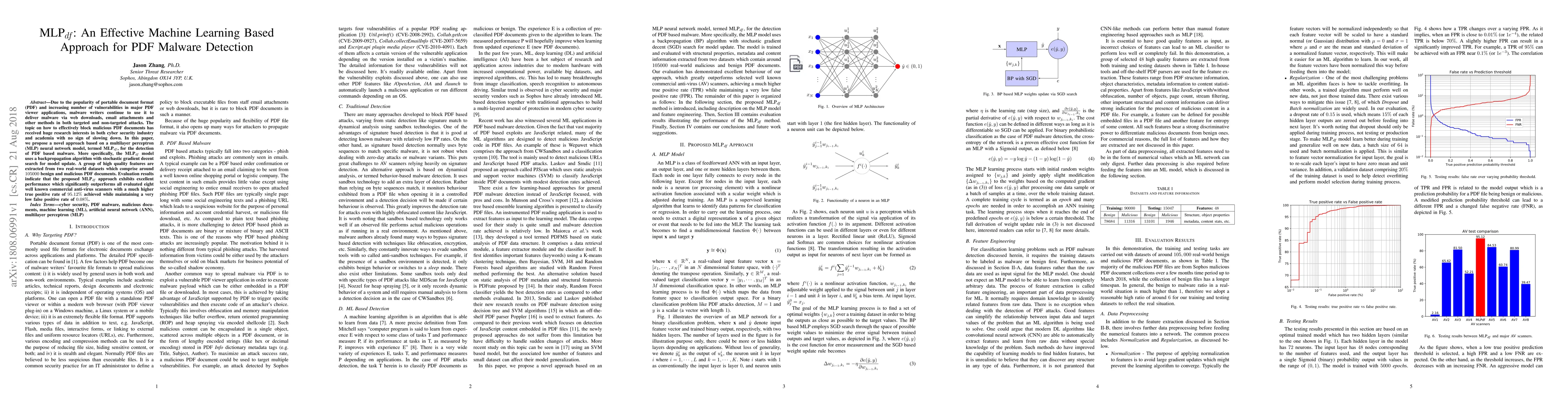 This paper proposes MLPdf, a machine learning-based approach using a multilayer perceptron neural network to detect PDF malware, achieving a true positive rate of 95.12% and a false positive rate of 0.08%, outperforming eight commercial anti-virus scanners.