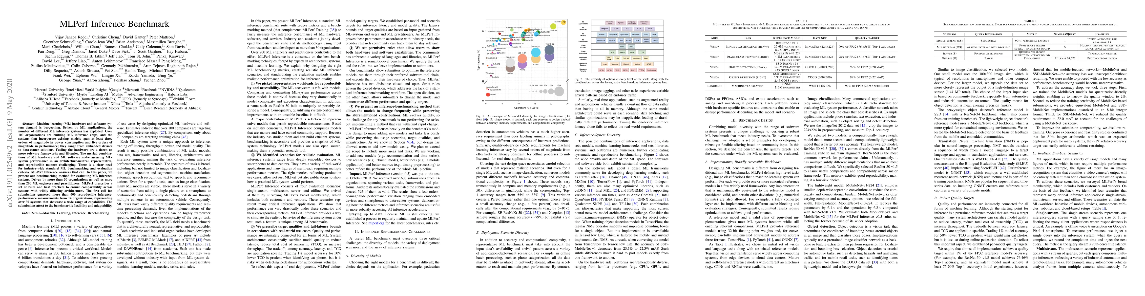 The MLPerf Inference Benchmark aims to standardize the evaluation of machine-learning inference systems across diverse architectures, providing a comprehensive set of rules and practices to ensure comparability. The initial submissions highlight the benchmark's flexibility and adaptability, with over 600 performance measurements from 14 organizations.