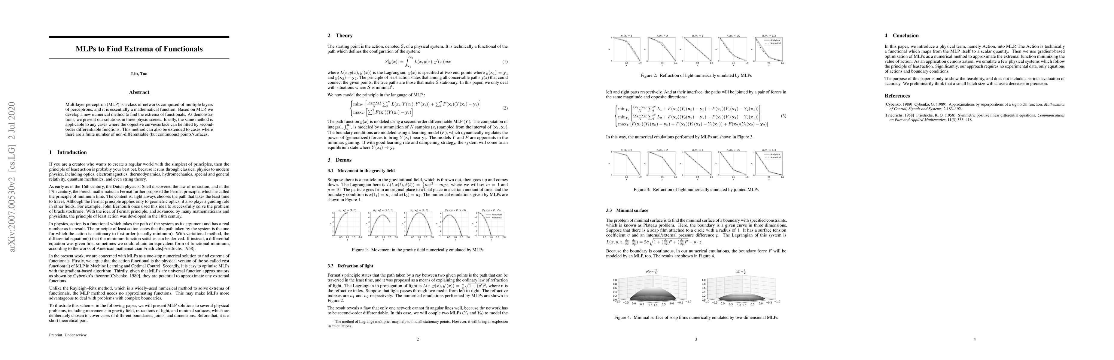 A new numerical method using multilayer perceptrons is proposed to find extrema of functionals, applicable to various cases with second-order differentiable functions, including physical scenes.