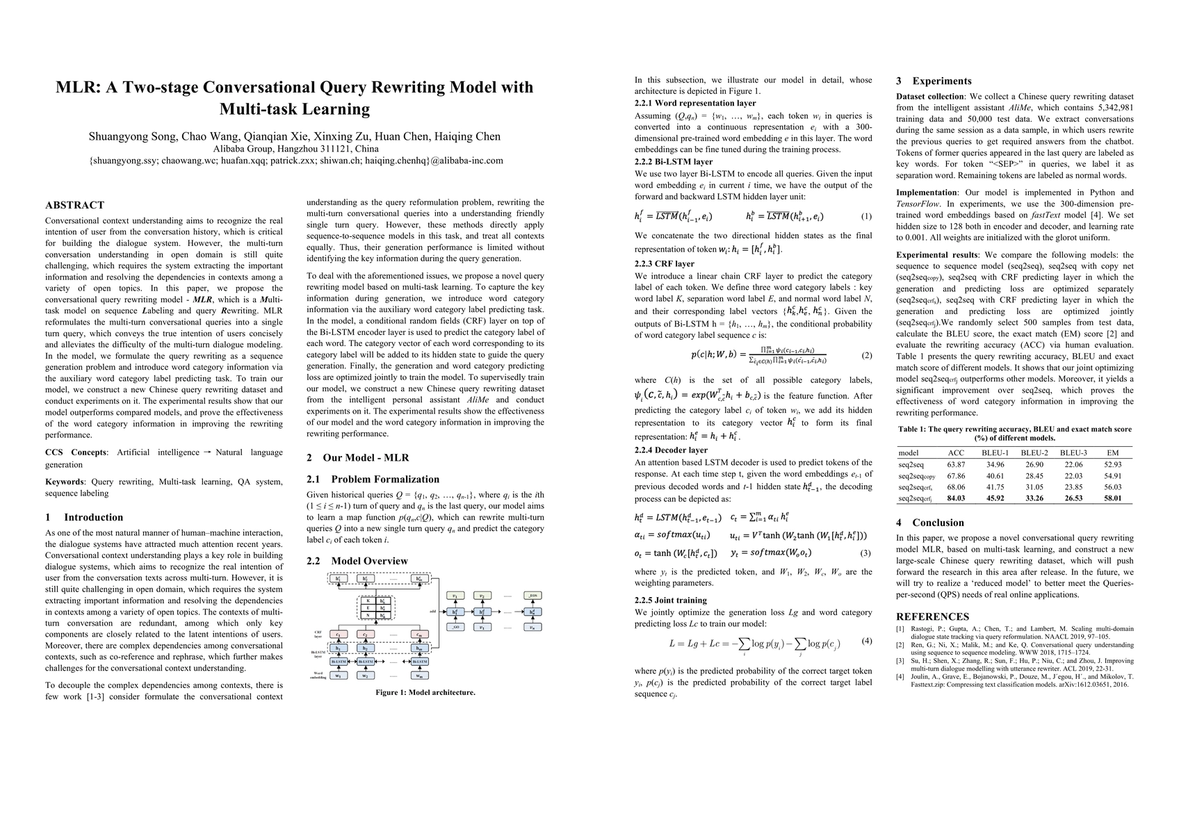 The paper proposes MLR, a two-stage conversational query rewriting model using Multi-task Learning to reformulate multi-turn queries into concise single-turn queries. The model incorporates sequence labeling and word category information to enhance understanding and performance, demonstrating superior results on a newly constructed Chinese dataset.