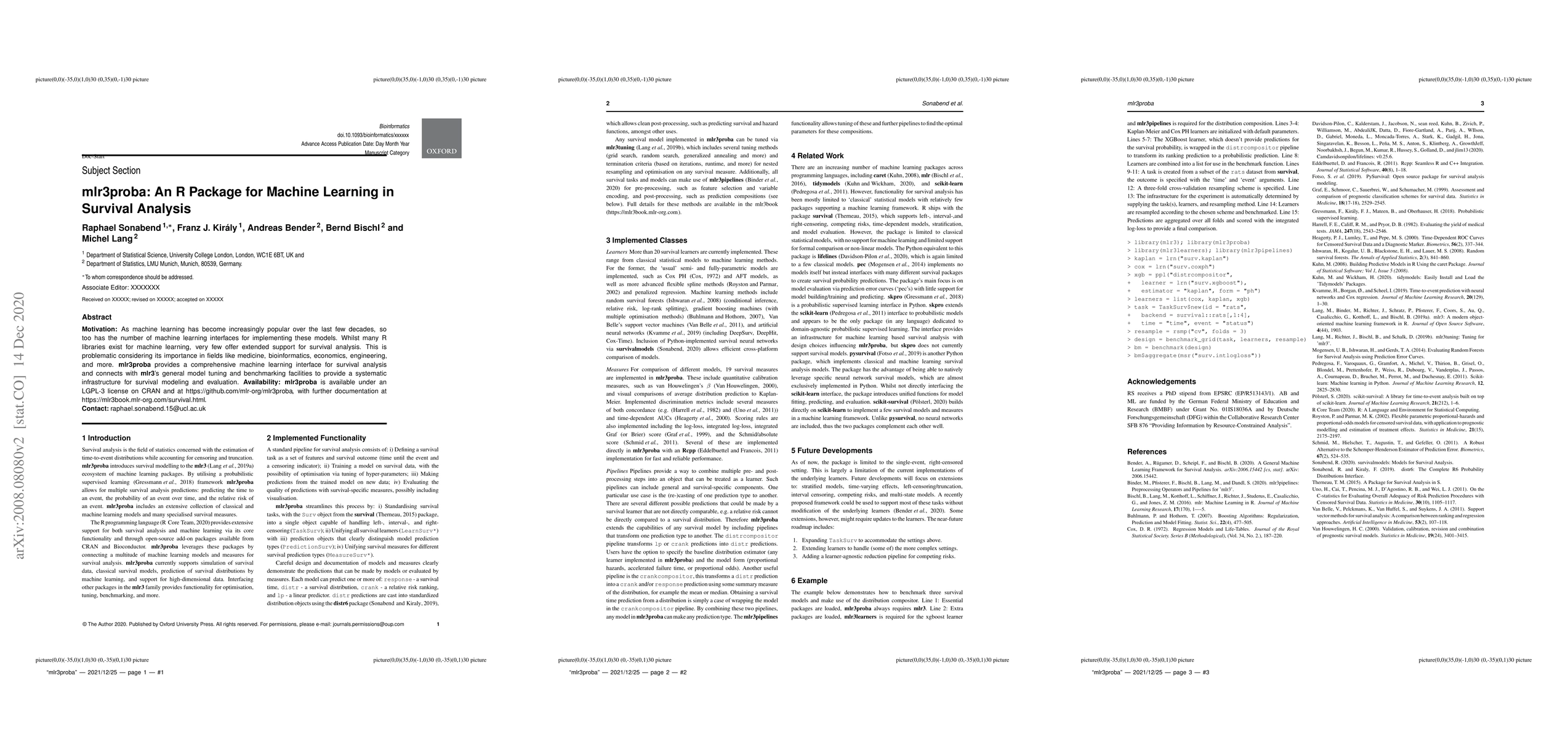 Summary: mlr3proba is an R package designed to facilitate machine learning in survival analysis, addressing the scarcity of specialized tools in this area. It integrates with mlr3 for robust model tuning and benchmarking, offering a comprehensive framework for survival modeling and evaluation.