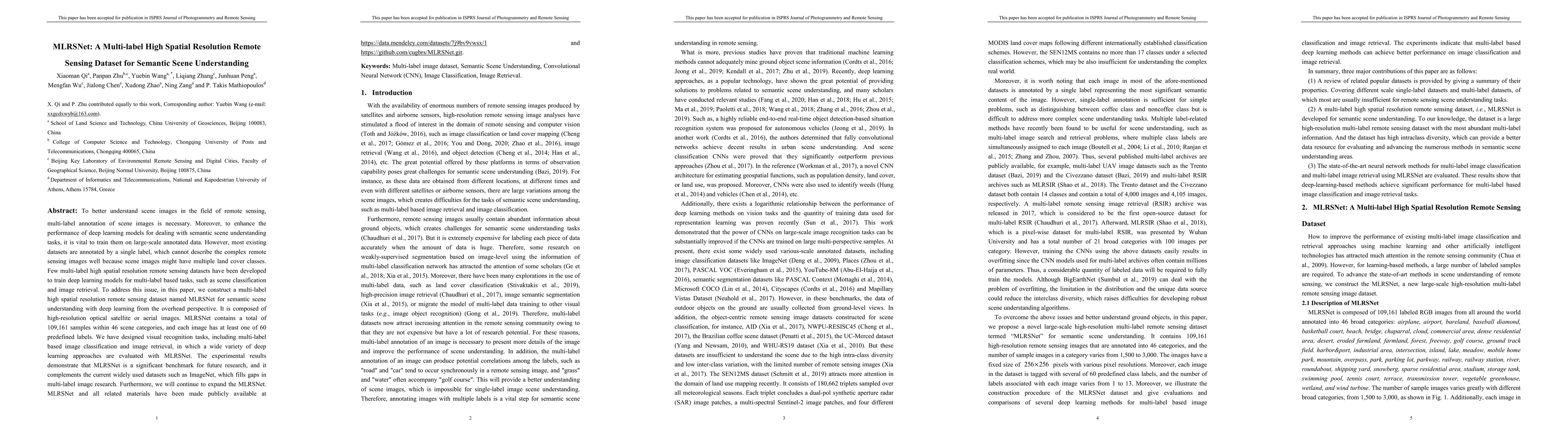 MLRSNet is a newly constructed multi-label high spatial resolution remote sensing dataset designed to enhance deep learning models for semantic scene understanding. It comprises 109,161 samples across 46 categories, each with at least 60 predefined labels, and is publicly available for further research and model evaluation.