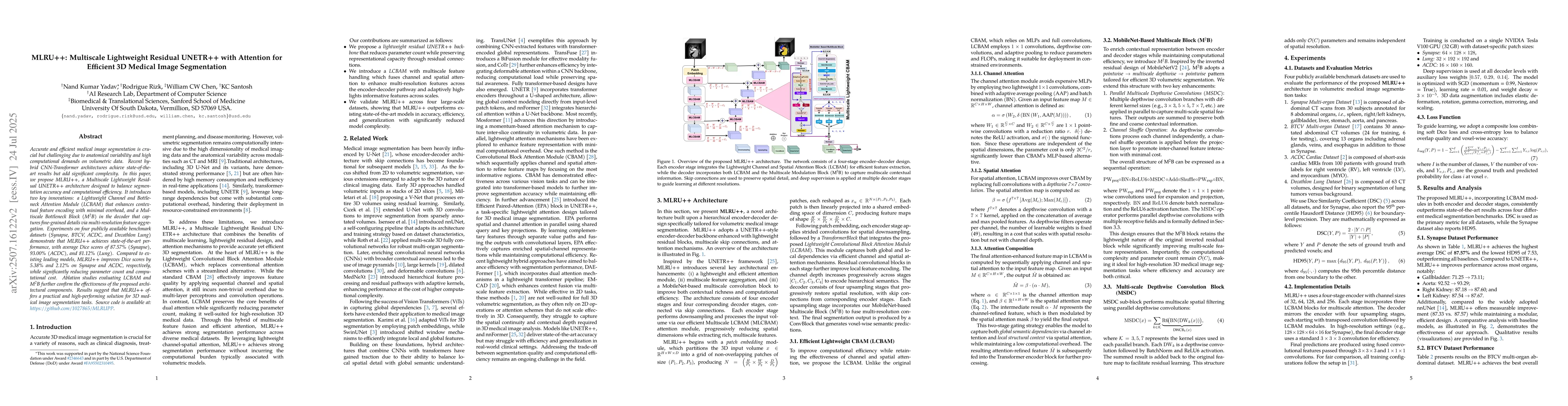 Accurate and efficient medical image segmentation is crucial but challenging due to anatomical variability and high computational demands on volumetric data. Recent hybrid CNN-Transformer architectures achieve state-of-the-art results but add significant complexity. In this paper, we propose MLRU++, a Multiscale Lightweight Residual UNETR++ architecture designed to balance segmentation accuracy and computational efficiency. It introduces two key innovations: a Lightweight Channel and Bottleneck Attention Module (LCBAM) that enhances contextual feature encoding with minimal overhead, and a Multiscale Bottleneck Block (M2B) in the decoder that captures fine-grained details via multi-resolution feature aggregation. Experiments on four publicly available benchmark datasets (Synapse, BTCV, ACDC, and Decathlon Lung) demonstrate that MLRU++ achieves state-of-the-art performance, with average Dice scores of 87.57% (Synapse), 93.00% (ACDC), and 81.12% (Lung). Compared to existing leading models, MLRU++ improves Dice scores by 5.38% and 2.12% on Synapse and ACDC, respectively, while significantly reducing parameter count and computational cost. Ablation studies evaluating LCBAM and M2B further confirm the effectiveness of the proposed architectural components. Results suggest that MLRU++ offers a practical and high-performing solution for 3D medical image segmentation tasks. Source code is available at: https://github.com/1027865/MLRUPP