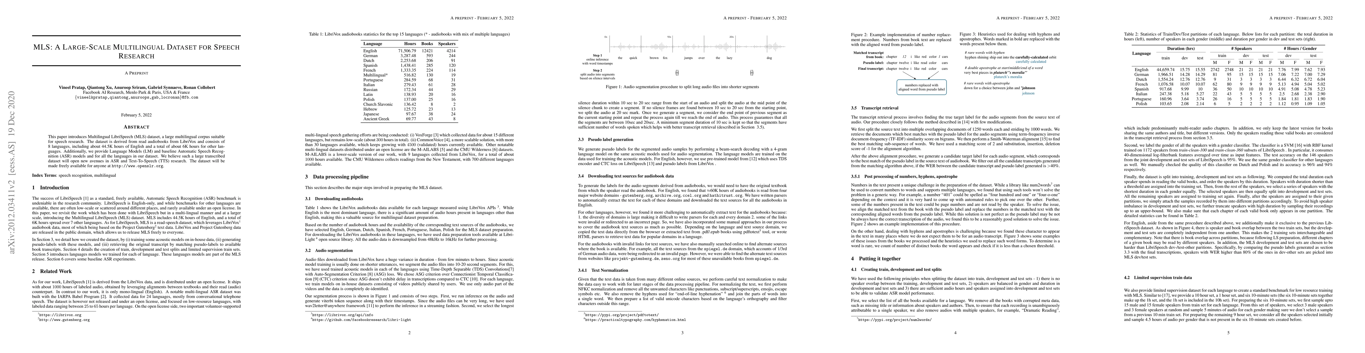 The MLS dataset, derived from LibriVox audiobooks, offers 8 languages totaling 50.5K hours for speech research, including English and 6K hours for other languages. It includes Language Models and ASR baselines, aiming to advance ASR and TTS research, and will be freely accessible.