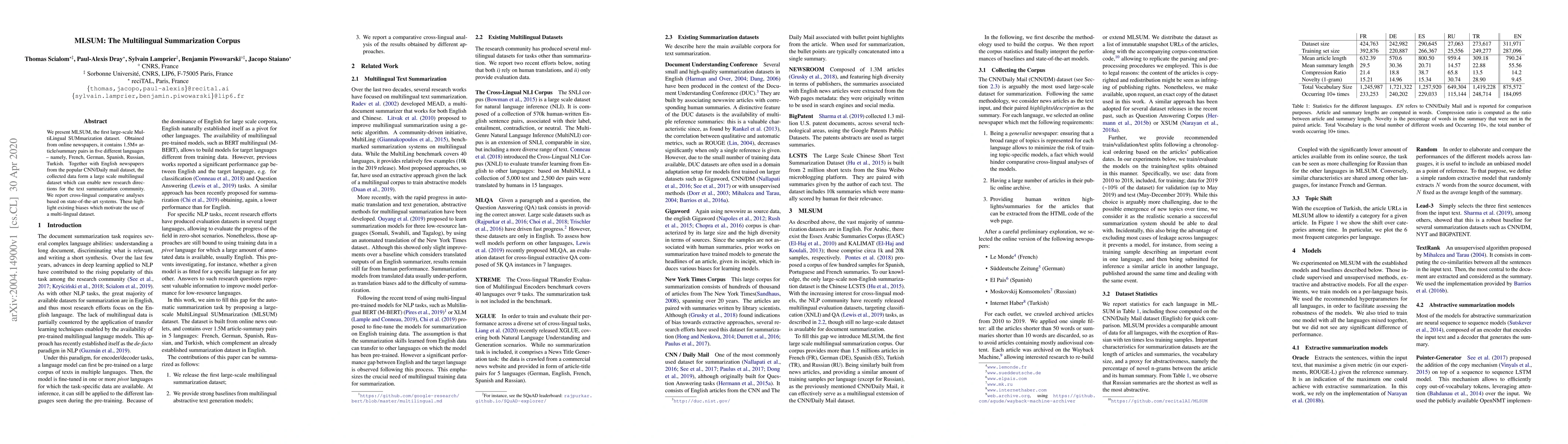 The MLSUM corpus is a large-scale multilingual summarization dataset with 1.5M+ article/summary pairs in five languages, enabling new research directions for text summarization. The dataset highlights existing biases and motivates the use of multi-lingual datasets.