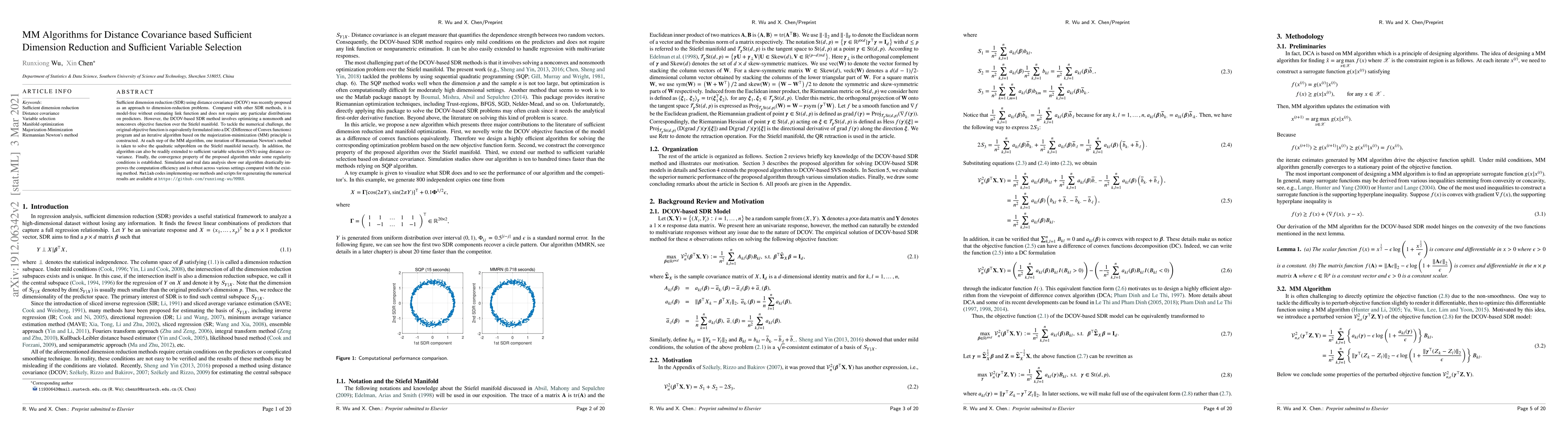 This paper proposes an efficient MM algorithm for sufficient dimension reduction (SDR) and sufficient variable selection (SVS) using distance covariance (DCOV). The method transforms the nonsmooth and nonconvex optimization problem into a DC program, enabling the use of an iterative MM algorithm with Riemannian Newton's method for improved computation efficiency and robustness.