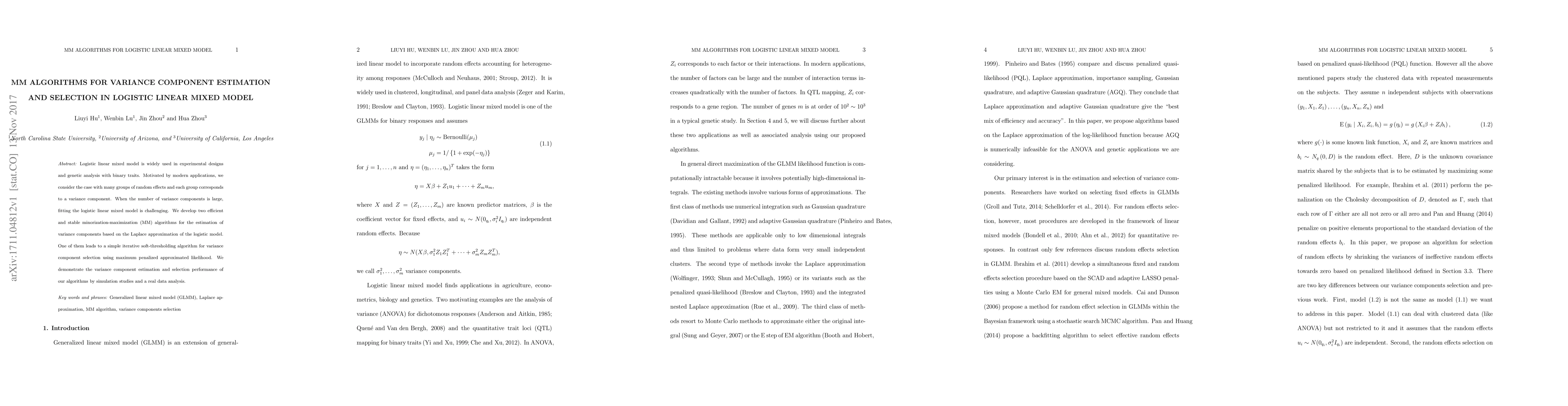 This paper develops two efficient MM algorithms for estimating and selecting variance components in logistic linear mixed models, especially when dealing with many groups of random effects. The algorithms utilize the Laplace approximation and are demonstrated through simulation studies and real data analysis.