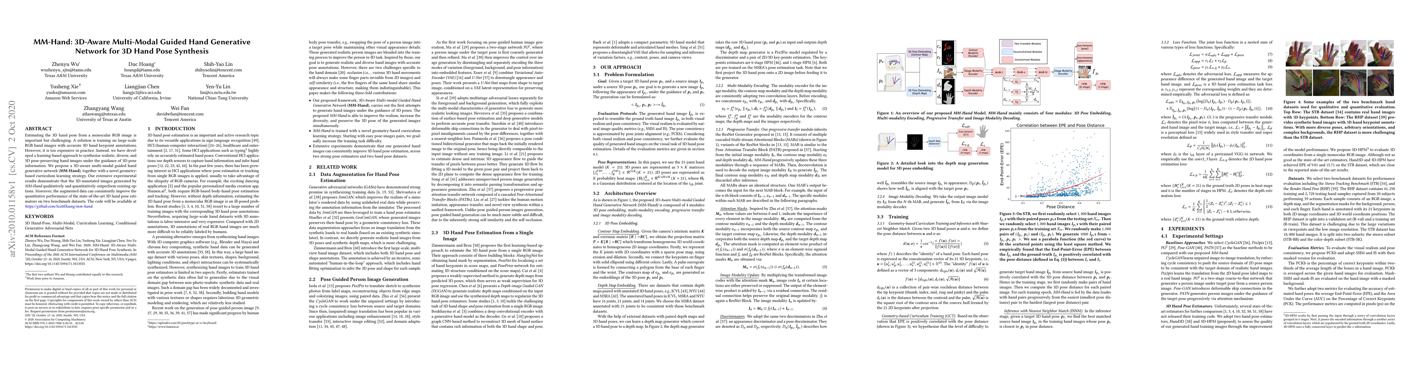 The paper introduces MM-Hand, a 3D-aware multi-modal guided generative network for synthesizing realistic 3D hand pose images from monocular RGB inputs, using a novel curriculum learning strategy. The generated data significantly enhances the performance of existing 3D hand pose estimators.