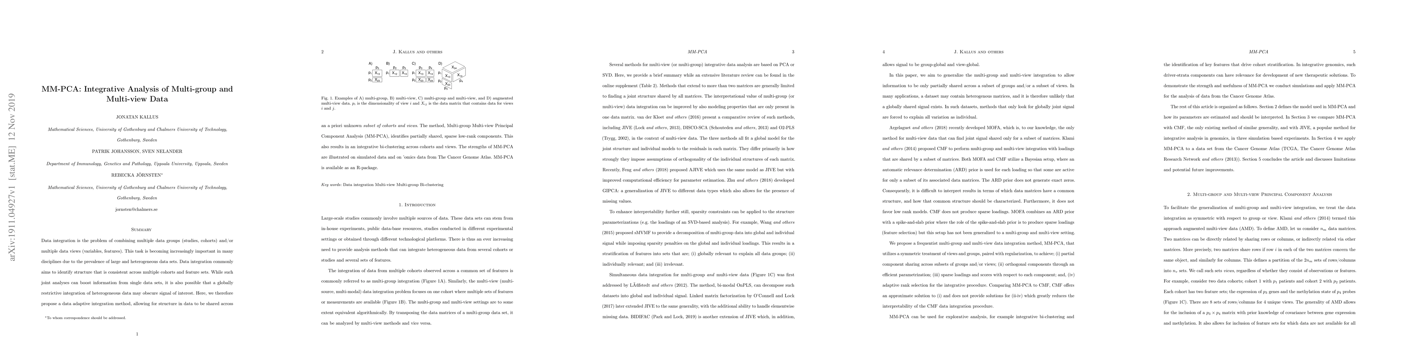This paper proposes MM-PCA, a data adaptive method for integrating multi-group and multi-view datasets, identifying shared structures across subsets of cohorts and views. Demonstrated on simulated data and 'omics data from The Cancer Genome Atlas, MM-PCA is available as an R-package.
