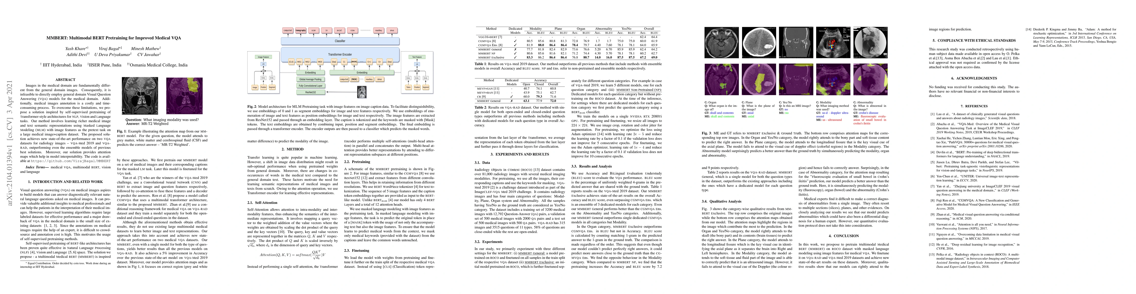 The paper introduces MMBERT, a multimodal BERT pretraining method for enhanced medical Visual Question Answering (VQA) by leveraging self-supervised learning on medical image-caption datasets. This approach achieves state-of-the-art results on radiology VQA datasets and offers interpretable attention maps.