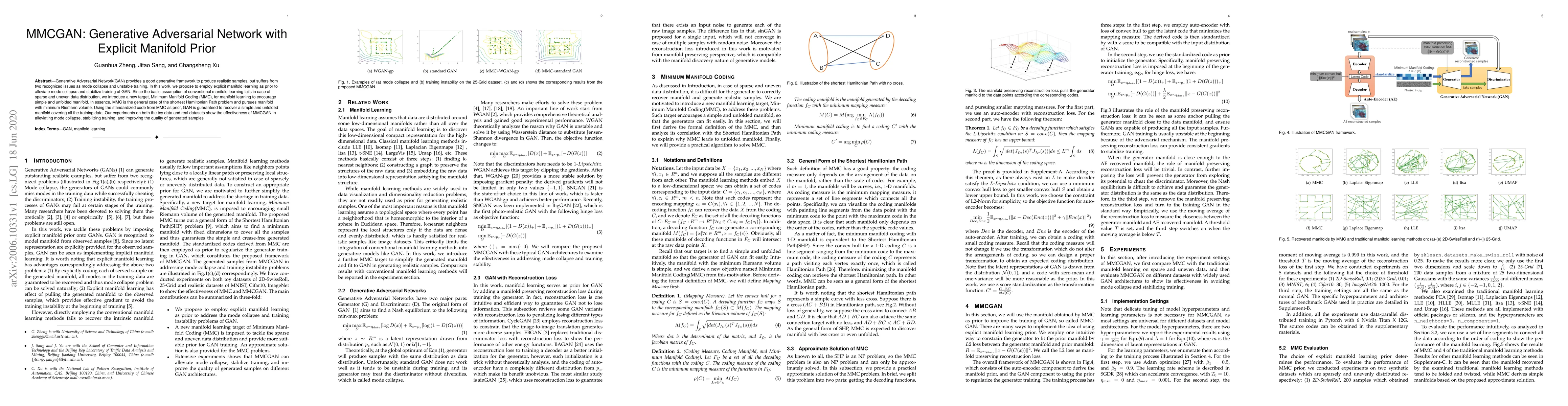 Generative Adversarial Network(GAN) provides a good generative framework to produce realistic samples, but suffers from two recognized issues as mode collapse and unstable training. In this work, we propose to employ explicit manifold learning as prior to alleviate mode collapse and stabilize training of GAN. Since the basic assumption of conventional manifold learning fails in case of sparse and uneven data distribution, we introduce a new target, Minimum Manifold Coding (MMC), for manifold learning to encourage simple and unfolded manifold. In essence, MMC is the general case of the shortest Hamiltonian Path problem and pursues manifold with minimum Riemann volume. Using the standardized code from MMC as prior, GAN is guaranteed to recover a simple and unfolded manifold covering all the training data. Our experiments on both the toy data and real datasets show the effectiveness of MMCGAN in alleviating mode collapse, stabilizing training, and improving the quality of generated samples.
