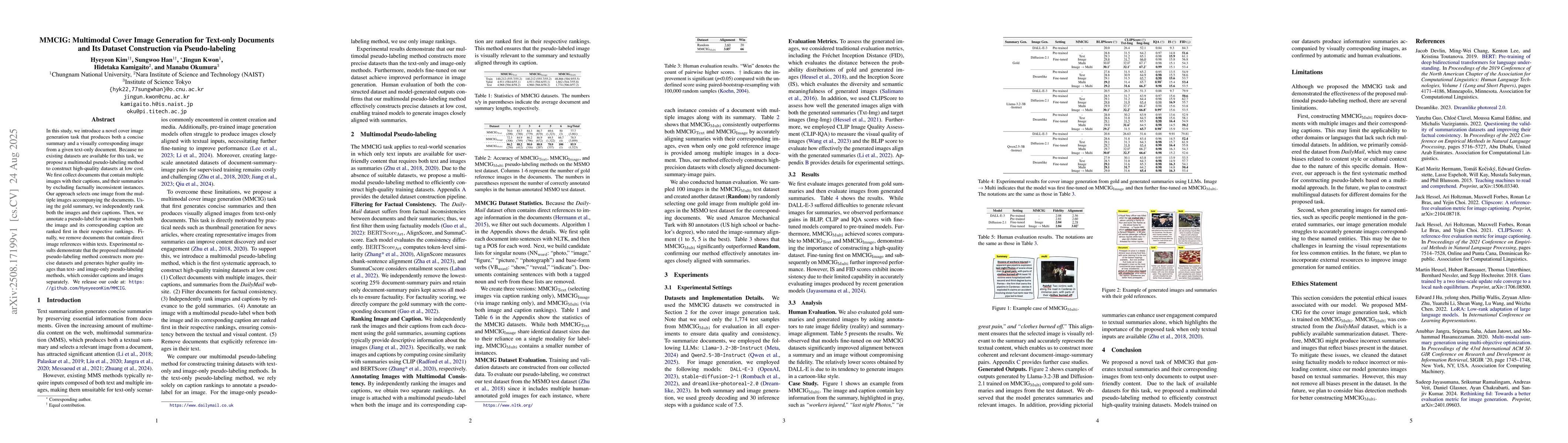 In this study, we introduce a novel cover image generation task that produces both a concise summary and a visually corresponding image from a given text-only document. Because no existing datasets are available for this task, we propose a multimodal pseudo-labeling method to construct high-quality datasets at low cost. We first collect documents that contain multiple images with their captions, and their summaries by excluding factually inconsistent instances. Our approach selects one image from the multiple images accompanying the documents. Using the gold summary, we independently rank both the images and their captions. Then, we annotate a pseudo-label for an image when both the image and its corresponding caption are ranked first in their respective rankings. Finally, we remove documents that contain direct image references within texts. Experimental results demonstrate that the proposed multimodal pseudo-labeling method constructs more precise datasets and generates higher quality images than text- and image-only pseudo-labeling methods, which consider captions and images separately. We release our code at: https://github.com/HyeyeeonKim/MMCIG