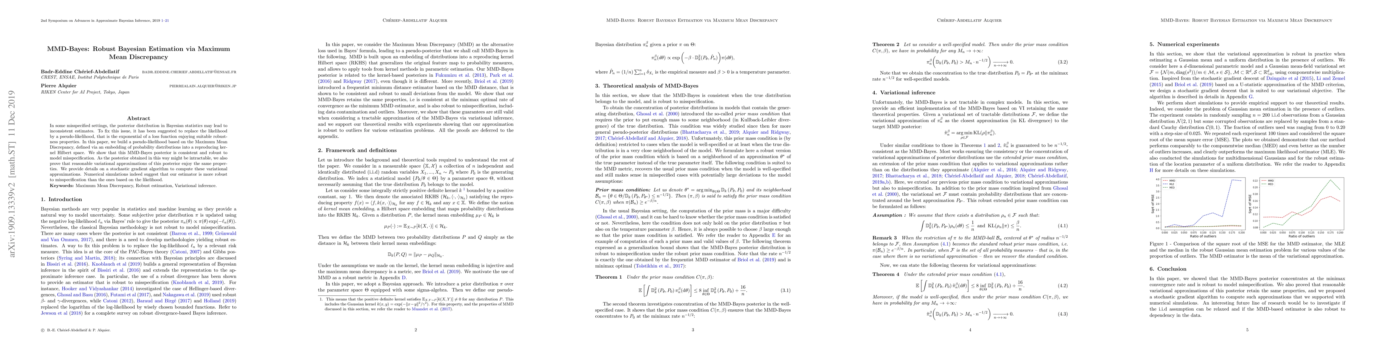 This paper proposes MMD-Bayes, a robust Bayesian estimation method using Maximum Mean Discrepancy (MMD) to replace the traditional likelihood function, ensuring consistency and robustness to model misspecification. It also introduces variational approximations for practical computation and demonstrates superior robustness through numerical simulations.
