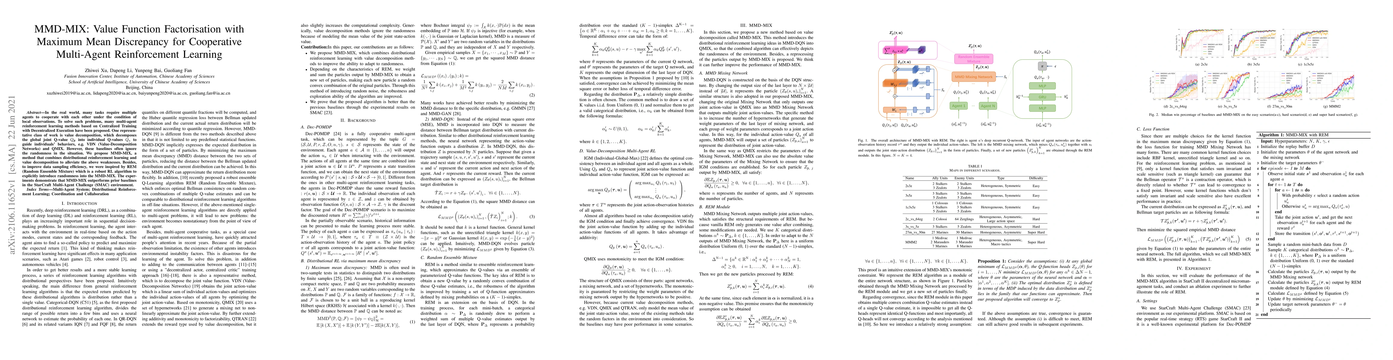 MMD-MIX integrates value function factorization with Maximum Mean Discrepancy to enhance cooperative multi-agent reinforcement learning, addressing the limitations of existing value decomposition methods. It introduces randomness to improve data sampling efficiency and outperforms prior baselines in the StarCraft Multi-Agent Challenge environment.