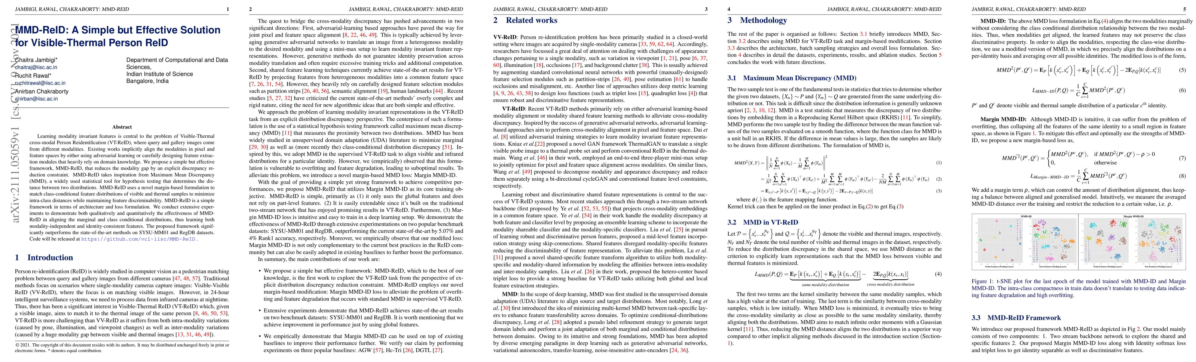 Learning modality invariant features is central to the problem of Visible-Thermal cross-modal Person Reidentification (VT-ReID), where query and gallery images come from different modalities. Existing works implicitly align the modalities in pixel and feature spaces by either using adversarial learning or carefully designing feature extraction modules that heavily rely on domain knowledge. We propose a simple but effective framework, MMD-ReID, that reduces the modality gap by an explicit discrepancy reduction constraint. MMD-ReID takes inspiration from Maximum Mean Discrepancy (MMD), a widely used statistical tool for hypothesis testing that determines the distance between two distributions. MMD-ReID uses a novel margin-based formulation to match class-conditional feature distributions of visible and thermal samples to minimize intra-class distances while maintaining feature discriminability. MMD-ReID is a simple framework in terms of architecture and loss formulation. We conduct extensive experiments to demonstrate both qualitatively and quantitatively the effectiveness of MMD-ReID in aligning the marginal and class conditional distributions, thus learning both modality-independent and identity-consistent features. The proposed framework significantly outperforms the state-of-the-art methods on SYSU-MM01 and RegDB datasets. Code will be released at https://github.com/vcl-iisc/MMD-ReID