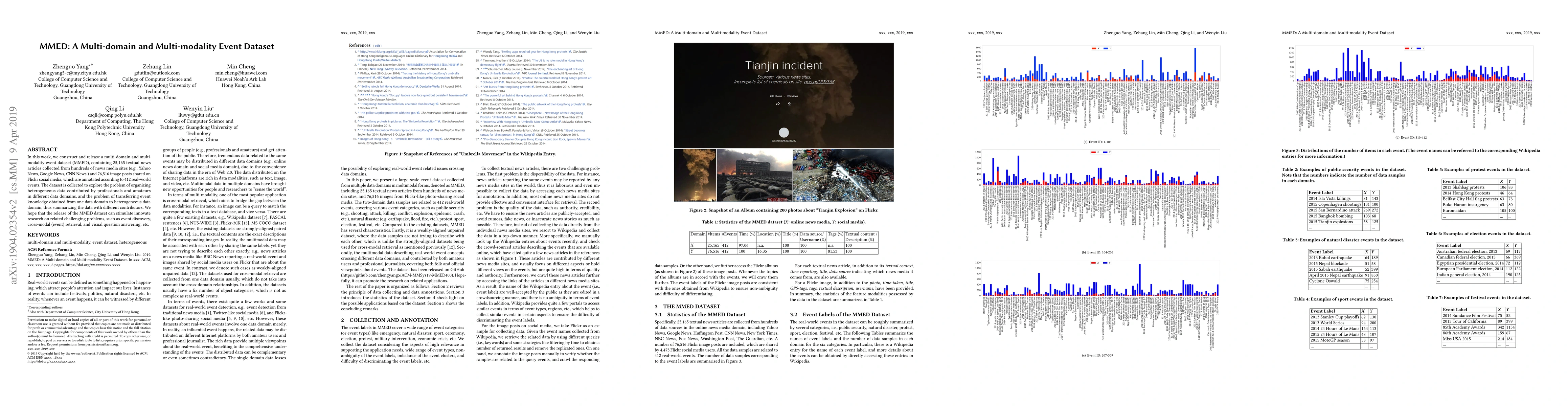 In this work, we construct and release a multi-domain and multi-modality event dataset (MMED), containing 25,165 textual news articles collected from hundreds of news media sites (e.g., Yahoo News, Google News, CNN News.) and 76,516 image posts shared on Flickr social media, which are annotated according to 412 real-world events. The dataset is collected to explore the problem of organizing heterogeneous data contributed by professionals and amateurs in different data domains, and the problem of transferring event knowledge obtained from one data domain to heterogeneous data domain, thus summarizing the data with different contributors. We hope that the release of the MMED dataset can stimulate innovate research on related challenging problems, such as event discovery, cross-modal (event) retrieval, and visual question answering, etc.