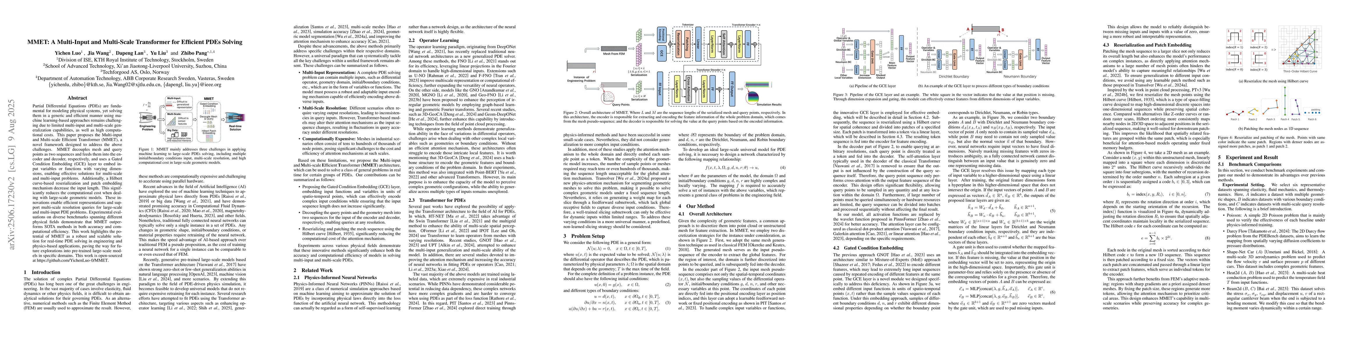 Partial Differential Equations (PDEs) are fundamental for modeling physical systems, yet solving them in a generic and efficient manner using machine learning-based approaches remains challenging due to limited multi-input and multi-scale generalization capabilities, as well as high computational costs. This paper proposes the Multi-input and Multi-scale Efficient Transformer (MMET), a novel framework designed to address the above challenges. MMET decouples mesh and query points as two sequences and feeds them into the encoder and decoder, respectively, and uses a Gated Condition Embedding (GCE) layer to embed input variables or functions with varying dimensions, enabling effective solutions for multi-scale and multi-input problems. Additionally, a Hilbert curve-based reserialization and patch embedding mechanism decrease the input length. This significantly reduces the computational cost when dealing with large-scale geometric models. These innovations enable efficient representations and support multi-scale resolution queries for large-scale and multi-input PDE problems. Experimental evaluations on diverse benchmarks spanning different physical fields demonstrate that MMET outperforms SOTA methods in both accuracy and computational efficiency. This work highlights the potential of MMET as a robust and scalable solution for real-time PDE solving in engineering and physics-based applications, paving the way for future explorations into pre-trained large-scale models in specific domains. This work is open-sourced at https://github.com/YichenLuo-0/MMET.