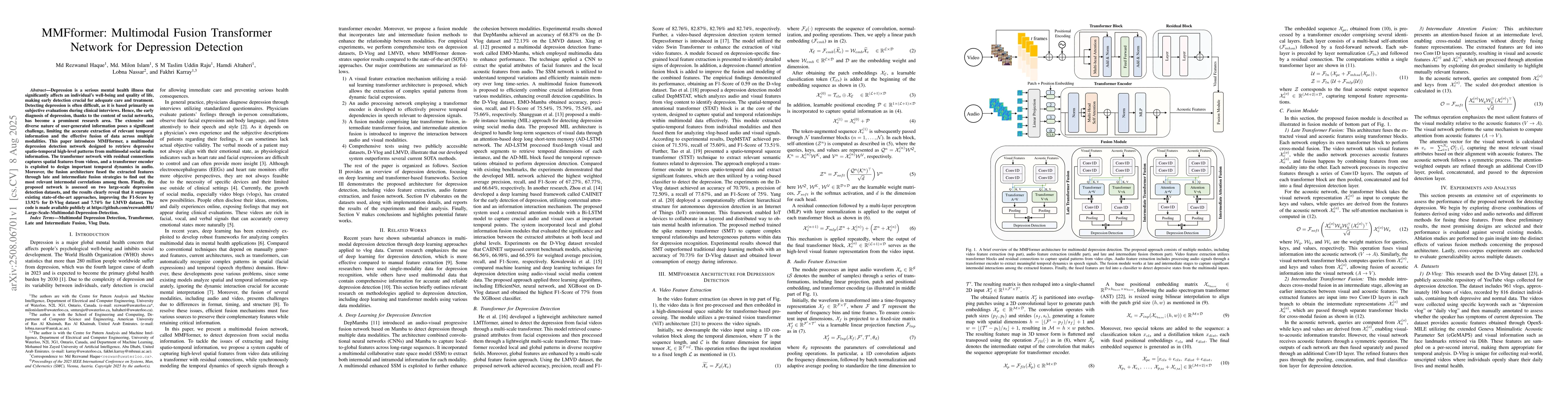 The paper introduces MMFformer, a multimodal fusion transformer network for depression detection using video and audio data from social media. It employs transformer networks with residual connections for spatial feature extraction from videos and transformer encoders for capturing temporal dynamics in audio. The fusion architecture uses late and intermediate fusion strategies to find relevant intermodal correlations.