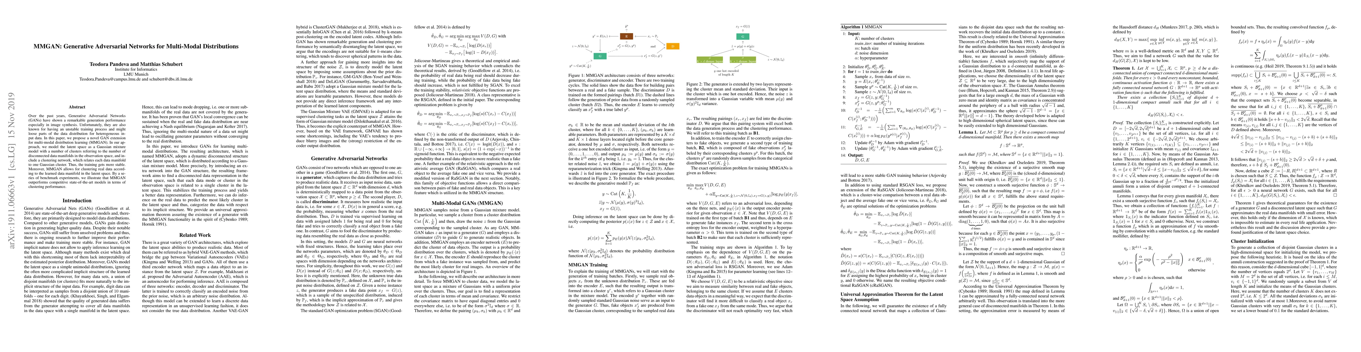 Over the past years, Generative Adversarial Networks (GANs) have shown a remarkable generation performance especially in image synthesis. Unfortunately, they are also known for having an unstable training process and might loose parts of the data distribution for heterogeneous input data. In this paper, we propose a novel GAN extension for multi-modal distribution learning (MMGAN). In our approach, we model the latent space as a Gaussian mixture model with a number of clusters referring to the number of disconnected data manifolds in the observation space, and include a clustering network, which relates each data manifold to one Gaussian cluster. Thus, the training gets more stable. Moreover, MMGAN allows for clustering real data according to the learned data manifold in the latent space. By a series of benchmark experiments, we illustrate that MMGAN outperforms competitive state-of-the-art models in terms of clustering performance.