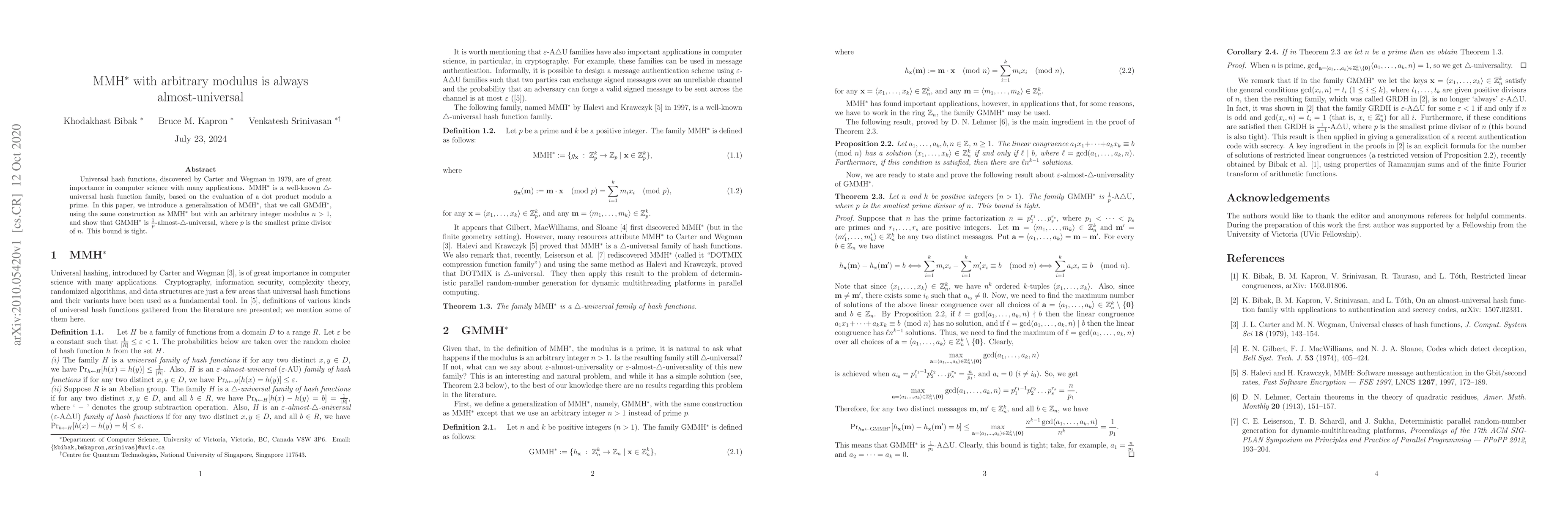 A new hash function family called GMMH* is introduced that uses an arbitrary integer modulus, showing it to be almost-universal with a tight bound of 1/p -almost-$ riangle$-universal where p is the smallest prime divisor of n.