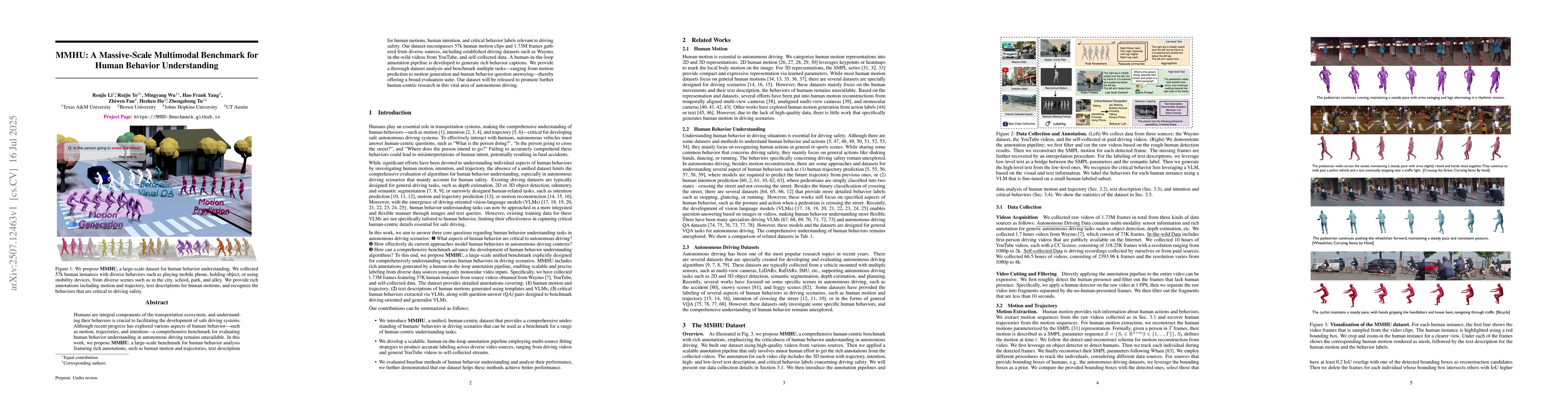 Humans are integral components of the transportation ecosystem, and understanding their behaviors is crucial to facilitating the development of safe driving systems. Although recent progress has explored various aspects of human behavior$\unicode{x2014}$such as motion, trajectories, and intention$\unicode{x2014}$a comprehensive benchmark for evaluating human behavior understanding in autonomous driving remains unavailable. In this work, we propose $\textbf{MMHU}$, a large-scale benchmark for human behavior analysis featuring rich annotations, such as human motion and trajectories, text description for human motions, human intention, and critical behavior labels relevant to driving safety. Our dataset encompasses 57k human motion clips and 1.73M frames gathered from diverse sources, including established driving datasets such as Waymo, in-the-wild videos from YouTube, and self-collected data. A human-in-the-loop annotation pipeline is developed to generate rich behavior captions. We provide a thorough dataset analysis and benchmark multiple tasks$\unicode{x2014}$ranging from motion prediction to motion generation and human behavior question answering$\unicode{x2014}$thereby offering a broad evaluation suite. Project page : https://MMHU-Benchmark.github.io.