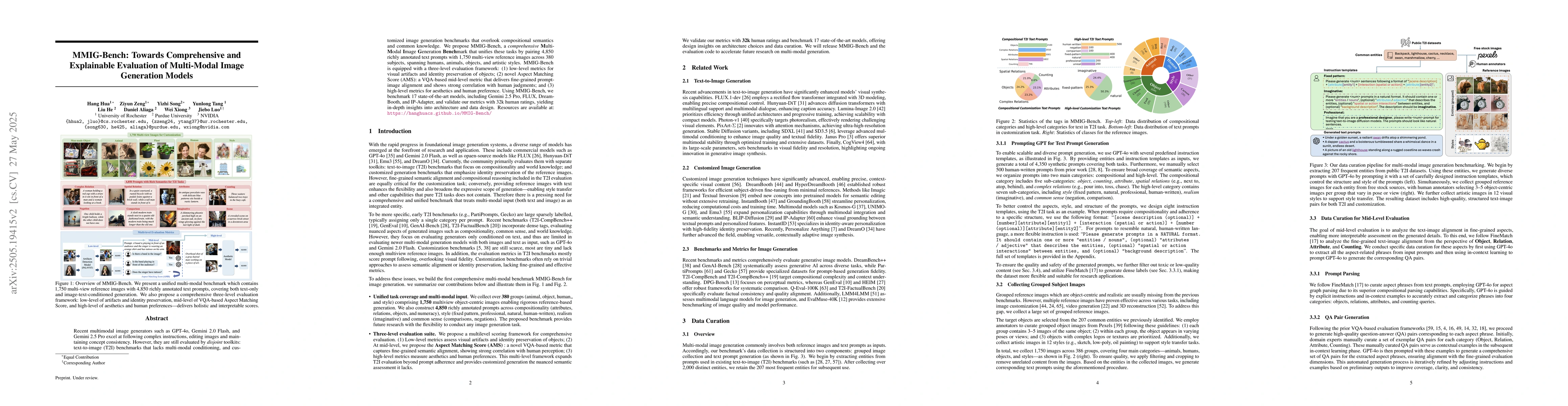 The research introduces MMIG-Bench, a comprehensive Multi-Modal Image Generation Benchmark that pairs 4,850 text prompts with 1,750 reference images across diverse categories. It employs a three-level evaluation framework comprising low-level metrics, Aspect Matching Score (AMS), and high-level metrics for aesthetics and human preference.