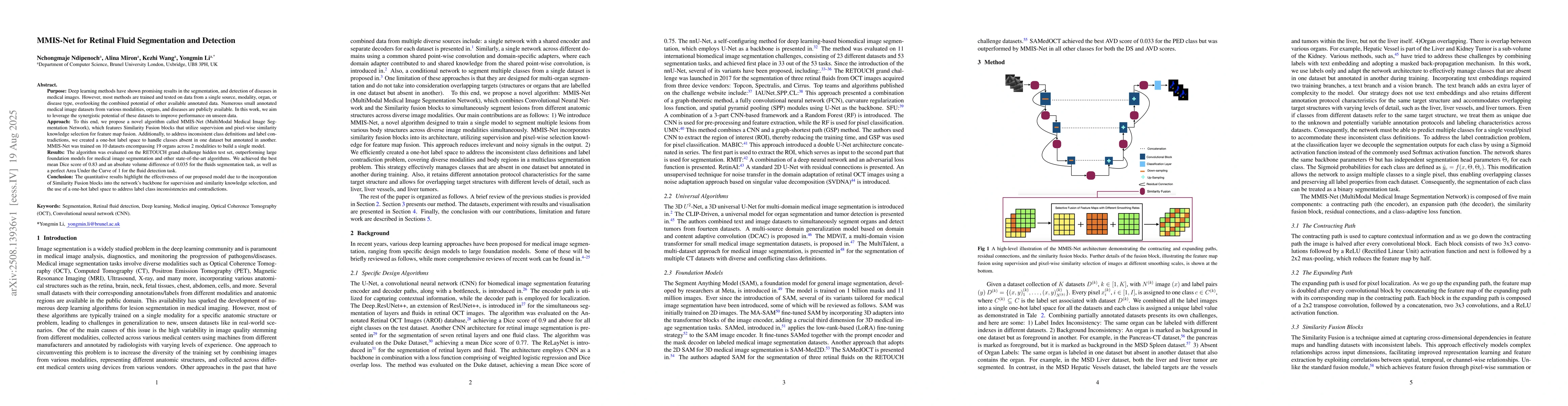 Purpose: Deep learning methods have shown promising results in the segmentation, and detection of diseases in medical images. However, most methods are trained and tested on data from a single source, modality, organ, or disease type, overlooking the combined potential of other available annotated data. Numerous small annotated medical image datasets from various modalities, organs, and diseases are publicly available. In this work, we aim to leverage the synergistic potential of these datasets to improve performance on unseen data. Approach: To this end, we propose a novel algorithm called MMIS-Net (MultiModal Medical Image Segmentation Network), which features Similarity Fusion blocks that utilize supervision and pixel-wise similarity knowledge selection for feature map fusion. Additionally, to address inconsistent class definitions and label contradictions, we created a one-hot label space to handle classes absent in one dataset but annotated in another. MMIS-Net was trained on 10 datasets encompassing 19 organs across 2 modalities to build a single model. Results: The algorithm was evaluated on the RETOUCH grand challenge hidden test set, outperforming large foundation models for medical image segmentation and other state-of-the-art algorithms. We achieved the best mean Dice score of 0.83 and an absolute volume difference of 0.035 for the fluids segmentation task, as well as a perfect Area Under the Curve of 1 for the fluid detection task. Conclusion: The quantitative results highlight the effectiveness of our proposed model due to the incorporation of Similarity Fusion blocks into the network's backbone for supervision and similarity knowledge selection, and the use of a one-hot label space to address label class inconsistencies and contradictions.
