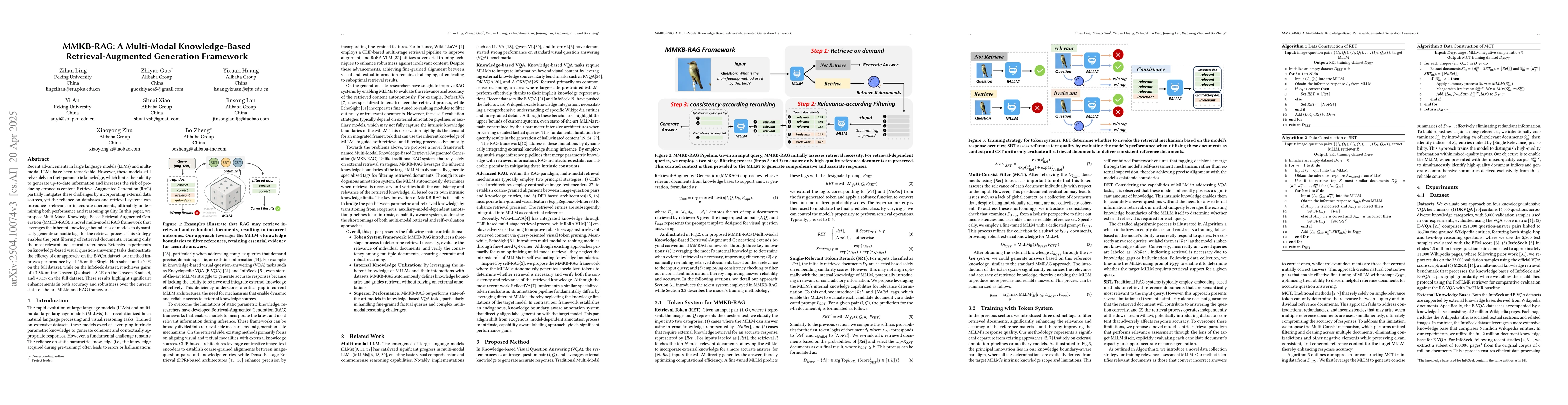 The paper introduces MMKB-RAG, a multi-modal retrieval-augmented generation framework that dynamically generates semantic tags to filter relevant documents, improving accuracy and robustness in knowledge-based visual question-answering tasks. Experiments show notable performance gains across various datasets, outperforming existing multi-modal large language models and RAG frameworks.
