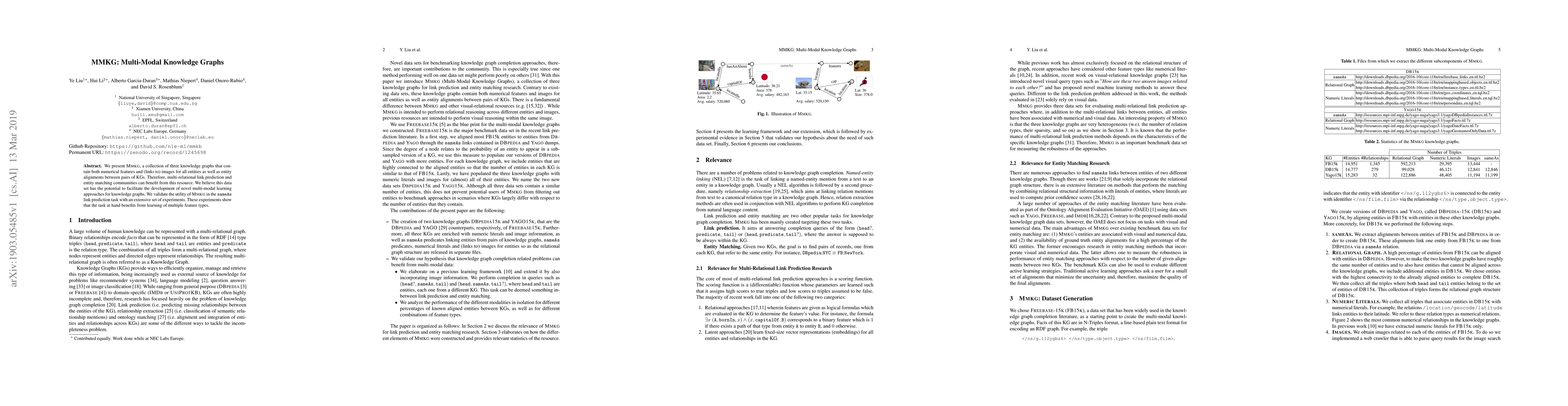 MMKG is a collection of three knowledge graphs enriched with numerical features and image links for entities, along with entity alignments. It aims to facilitate multi-modal learning approaches and was validated through extensive experiments on the sameAs link prediction task, demonstrating benefits from multi-feature learning.