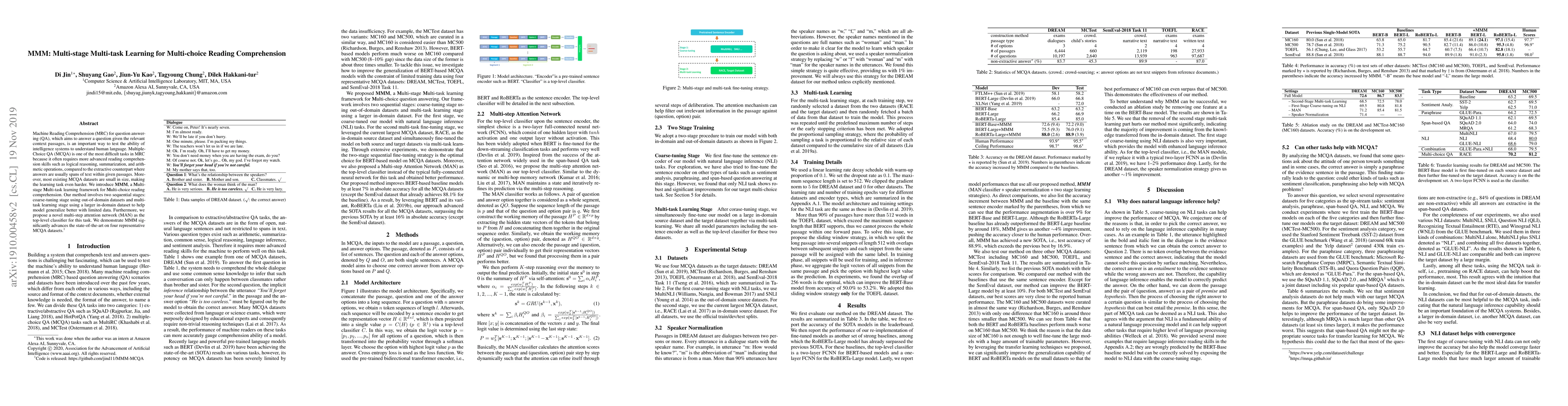 MMM is a Multi-stage Multi-task Learning framework designed to enhance Multi-choice Question Answering in Machine Reading Comprehension. It employs a two-stage training process and a novel multi-step attention network to improve comprehension and reasoning, achieving state-of-the-art results on multiple datasets.