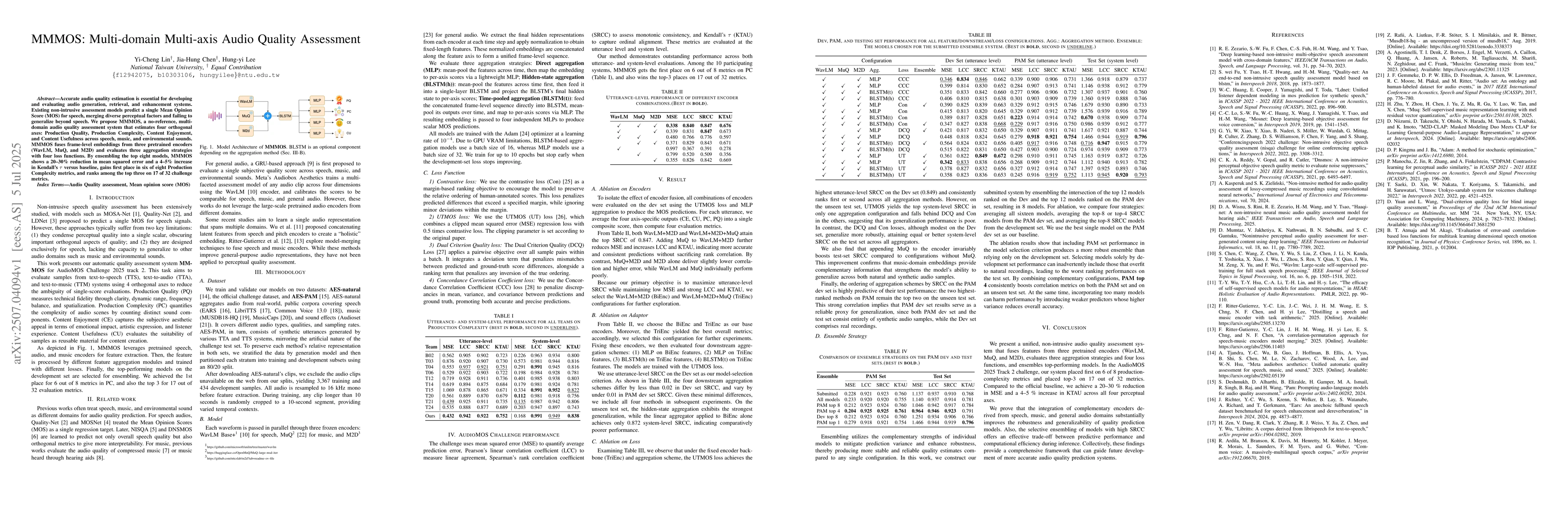 Accurate audio quality estimation is essential for developing and evaluating audio generation, retrieval, and enhancement systems. Existing non-intrusive assessment models predict a single Mean Opinion Score (MOS) for speech, merging diverse perceptual factors and failing to generalize beyond speech. We propose MMMOS, a no-reference, multi-domain audio quality assessment system that estimates four orthogonal axes: Production Quality, Production Complexity, Content Enjoyment, and Content Usefulness across speech, music, and environmental sounds. MMMOS fuses frame-level embeddings from three pretrained encoders (WavLM, MuQ, and M2D) and evaluates three aggregation strategies with four loss functions. By ensembling the top eight models, MMMOS shows a 20-30% reduction in mean squared error and a 4-5% increase in Kendall's {\tau} versus baseline, gains first place in six of eight Production Complexity metrics, and ranks among the top three on 17 of 32 challenge metrics.