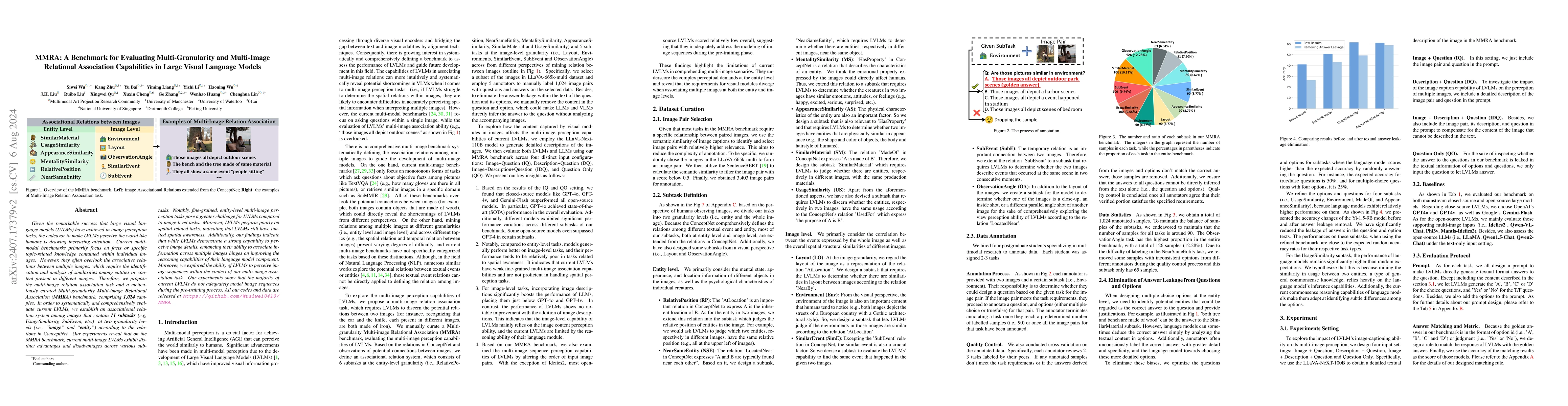 This paper introduces the MMRA benchmark, a comprehensive dataset for evaluating large visual language models (LVLMs) in multi-image relational association tasks across two granularities: images and entities. The benchmark contains 1026 samples and includes 11 subtasks to assess LVLMs' ability to understand associative relations in images, highlighting their challenges in fine-grained and spatial perception tasks.