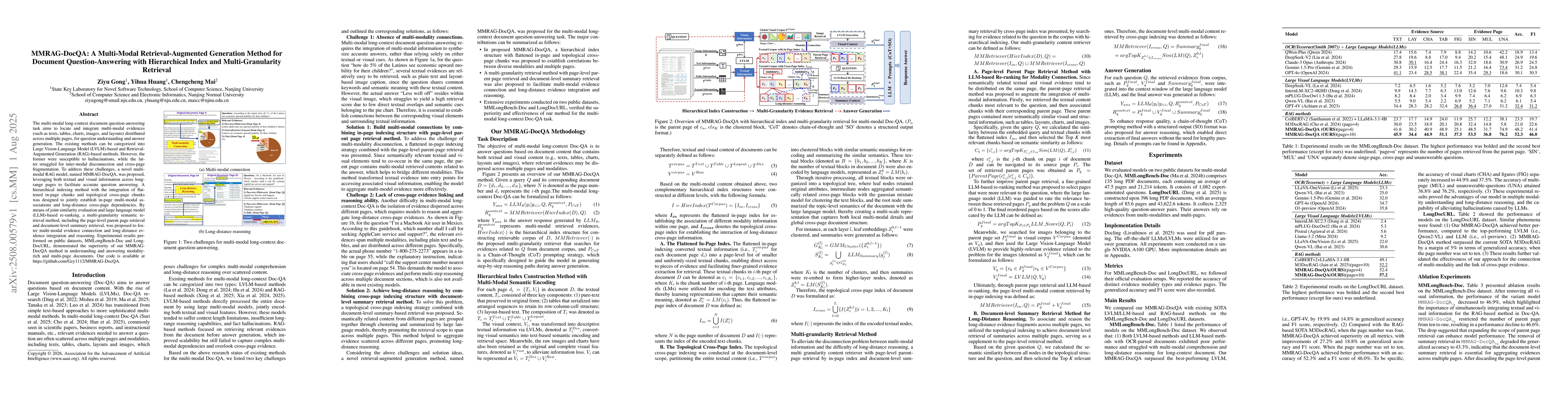 The multi-modal long-context document question-answering task aims to locate and integrate multi-modal evidences (such as texts, tables, charts, images, and layouts) distributed across multiple pages, for question understanding and answer generation. The existing methods can be categorized into Large Vision-Language Model (LVLM)-based and Retrieval-Augmented Generation (RAG)-based methods. However, the former were susceptible to hallucinations, while the latter struggled for inter-modal disconnection and cross-page fragmentation. To address these challenges, a novel multi-modal RAG model, named MMRAG-DocQA, was proposed, leveraging both textual and visual information across long-range pages to facilitate accurate question answering. A hierarchical indexing method with the integration of flattened in-page chunks and topological cross-page chunks was designed to jointly establish in-page multi-modal associations and long-distance cross-page dependencies. By means of joint similarity evaluation and large language model (LLM)-based re-ranking, a multi-granularity semantic retrieval method, including the page-level parent page retrieval and document-level summary retrieval, was proposed to foster multi-modal evidence connection and long-distance evidence integration and reasoning. Experimental results performed on public datasets, MMLongBench-Doc and LongDocURL, demonstrated the superiority of our MMRAG-DocQA method in understanding and answering modality-rich and multi-page documents.