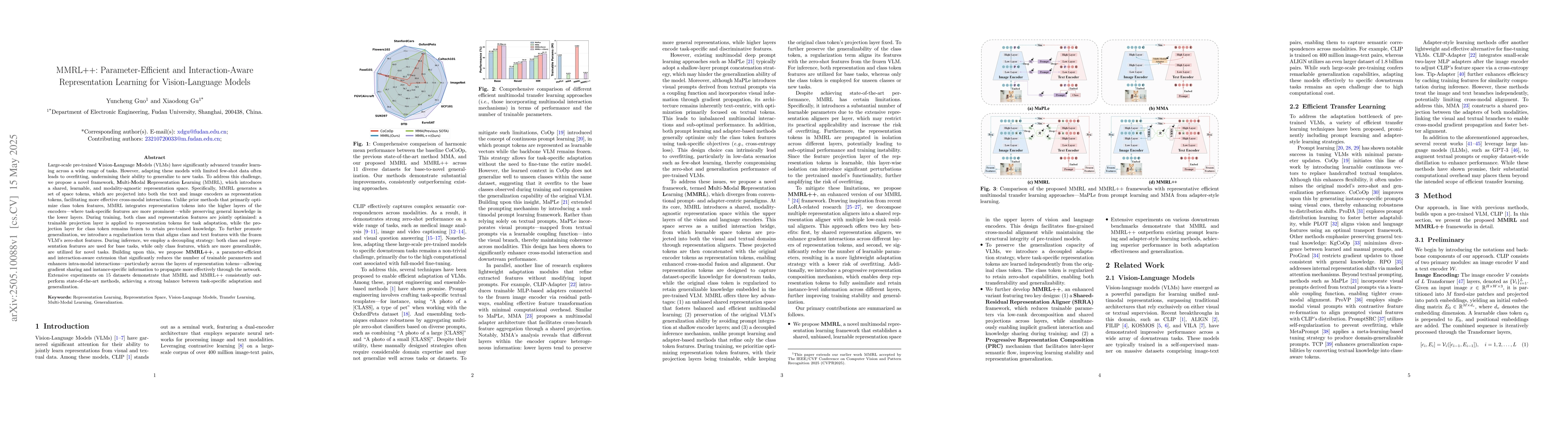 MMRL distinguishes itself by focusing on a shared, modality-agnostic representation space with representation tokens inserted into higher encoder layers, promoting task-specific feature optimization while preserving general knowledge. MMRL++ further enhances this by improving parameter efficiency and intra-modal interactions.